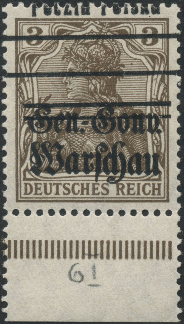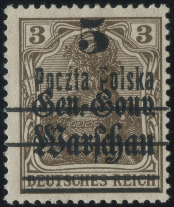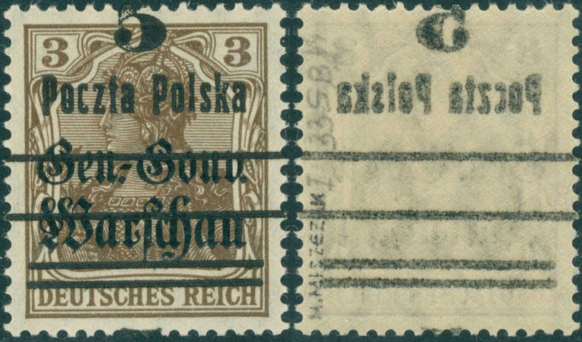 1918 wydanie PP/GGW, znaczek z silnie przesuniętym i lekko ukośnym nadrukiem pierwszej formy, gwarancja i oznaczenie. | Fi.9bIMK Mi.15I |