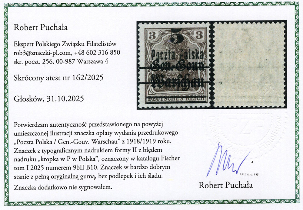 1918 wydanie PP/GGW. znaczek z silnie przesuniętym nadrukiem pierwszej formy, gwarancja i oznaczenie. | Fi.10cI MK Mi.8I |