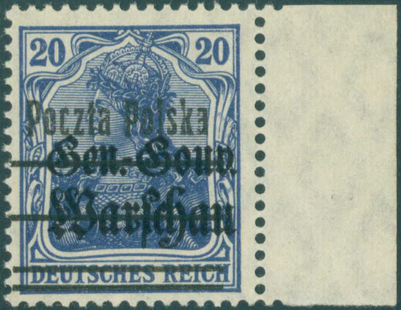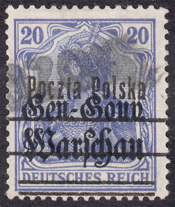 1918 wydanie PP/GGW, znaczek za 20 fen. w kolorze szafirowym z nadrukiem drugą formą, gwarancja i opis. | Fi.12bbII Mi.10IIb |