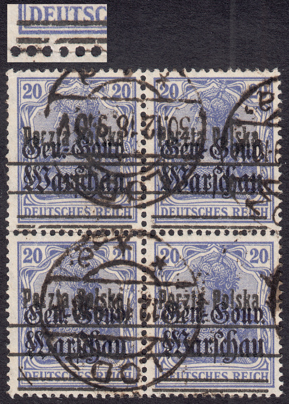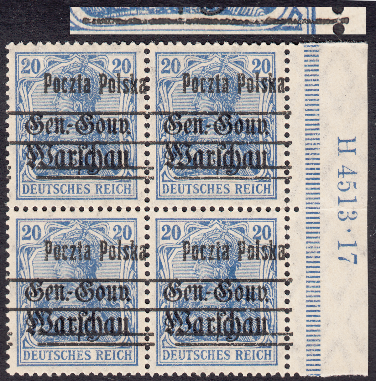 1918 wydanie PP/GGW, czworoblok znaczków za 20 fen. w kolorze jasnoniebieskim z nadrukiem pierwszą formą, na marginesie HAN 4513.17 nakładu podstawowego co pozwala dokładnie zidentyfikować nakład i kolor znaczka podstawowego, HAN nadruku GGW dla tego znaczka to 4821.17; na poz.50 niekatalogowane "zniekształcenia czwartej kreski", stan bez podlepki, słabe popękane pomiędzy górnymi znaczkami ząbki, dobry materiał porównawczy, | Fi.12Ic Mi.10Id |