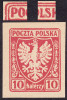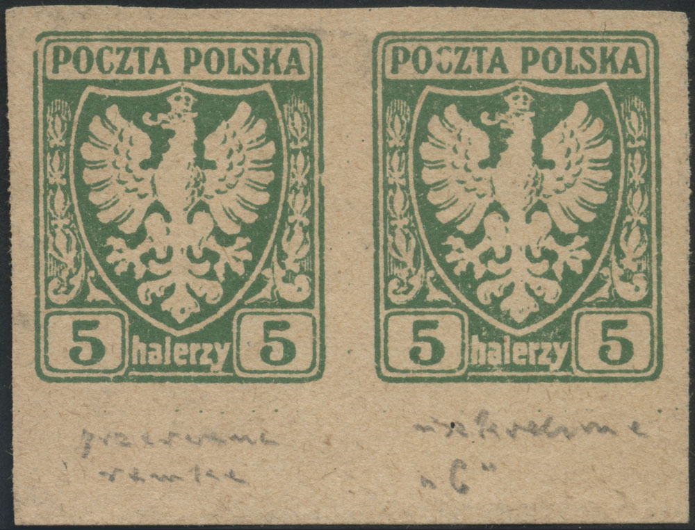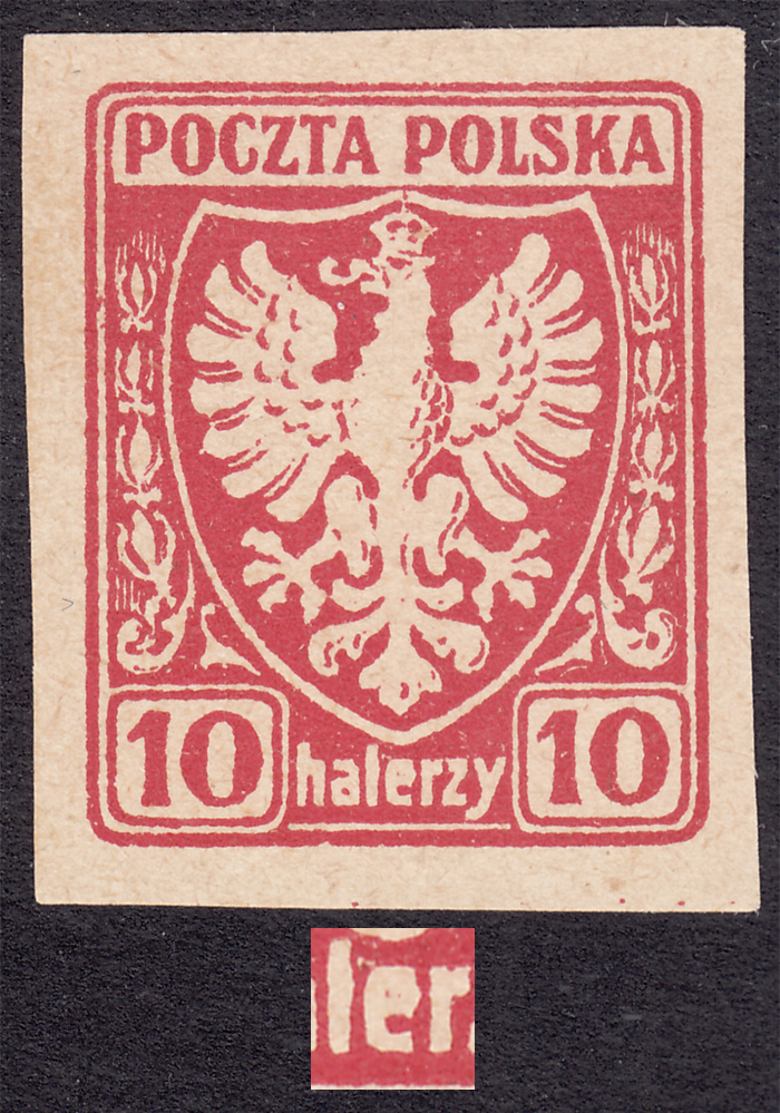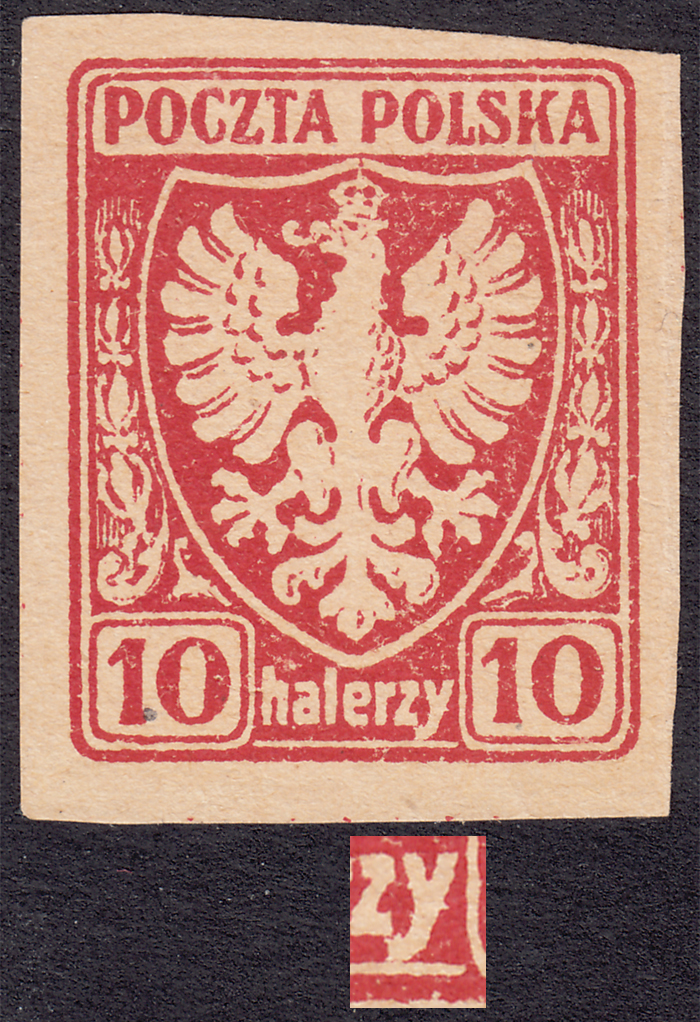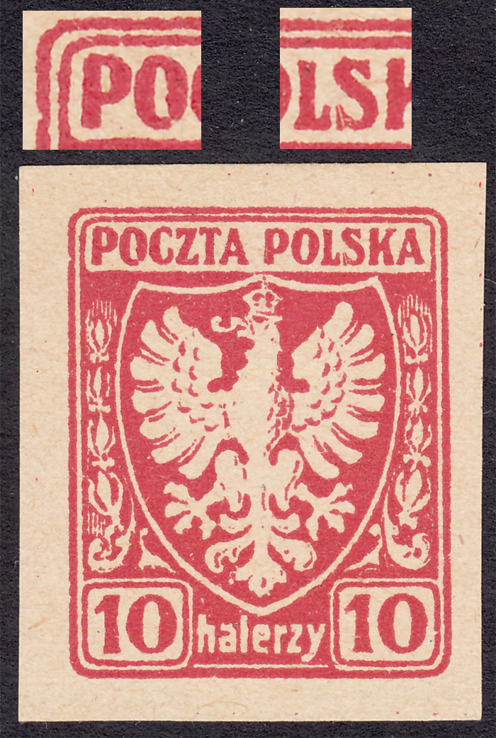 1919 wydanie Komisji Rządzącej, znaczek za 10 hal. z niekatalogowanymi błędami "przecięta litera O w POCZTA", "wcięcie w ramce po lewej" oraz "odcięta podstawa litery S w POLSKA", gwarancja Berbeka. | Fi.59 B Mi.58 |