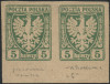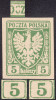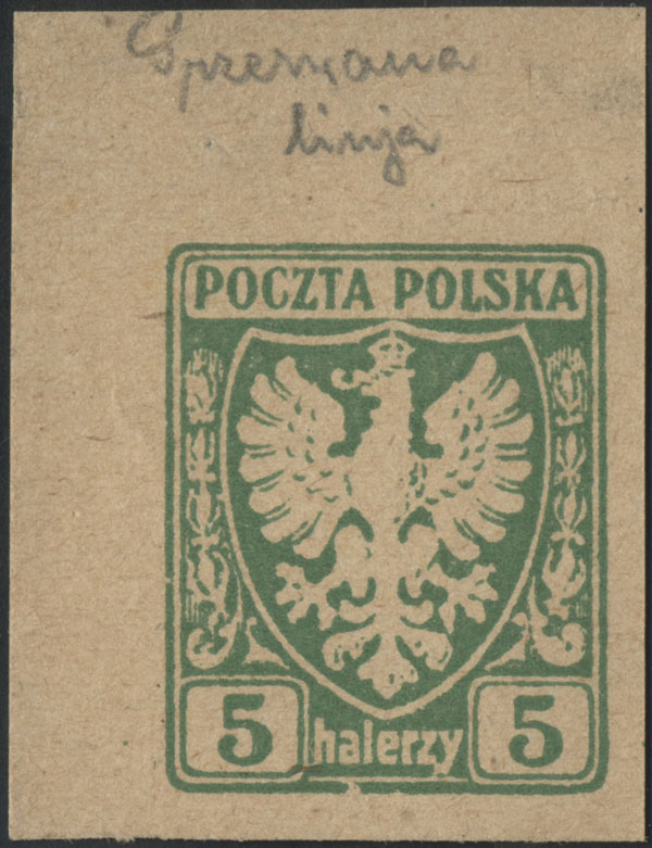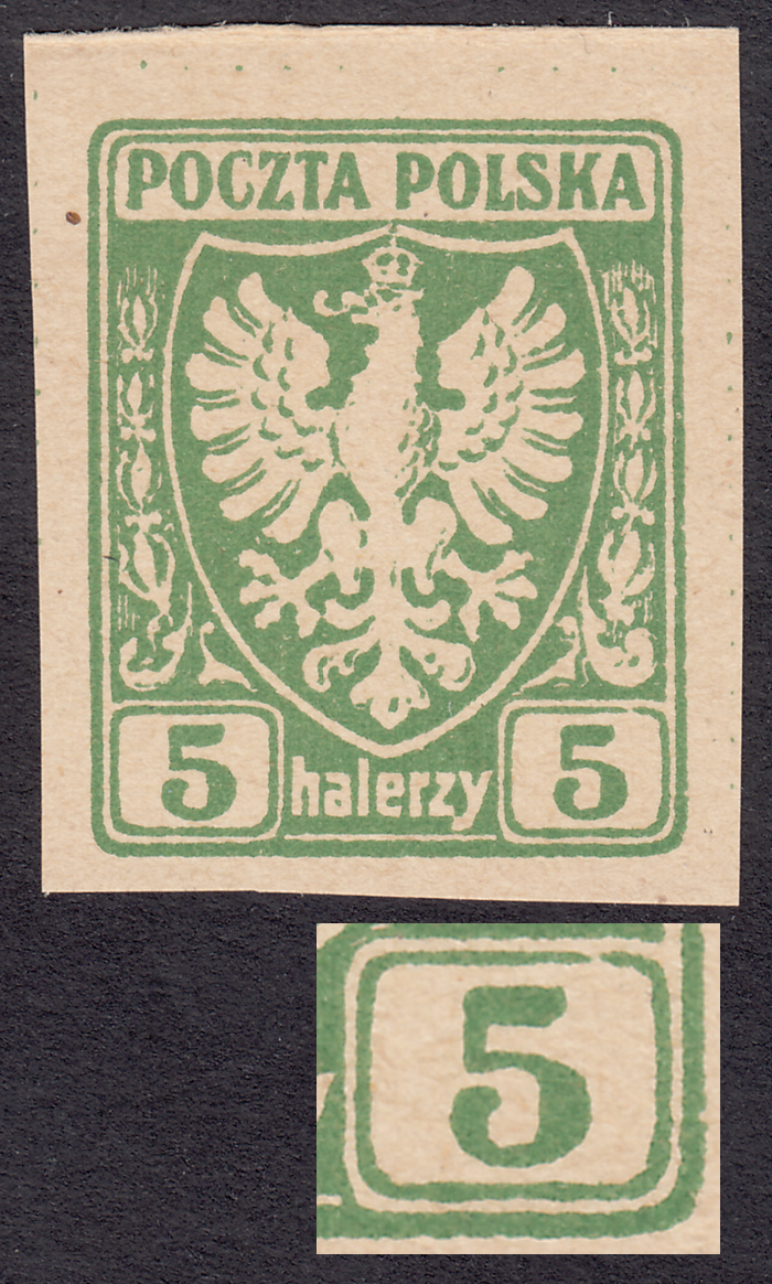 1919 wydanie Komisji Rządzącej, znaczek za 5 hal. z niekatalogowanym błędem "pionowa biała kreska nad prawą cyfrą 5", dodatkowo "lewa cyfra 5 znacznie grubsza niż prawa", gwarancja. | Fi.57 B Mi.56 |
