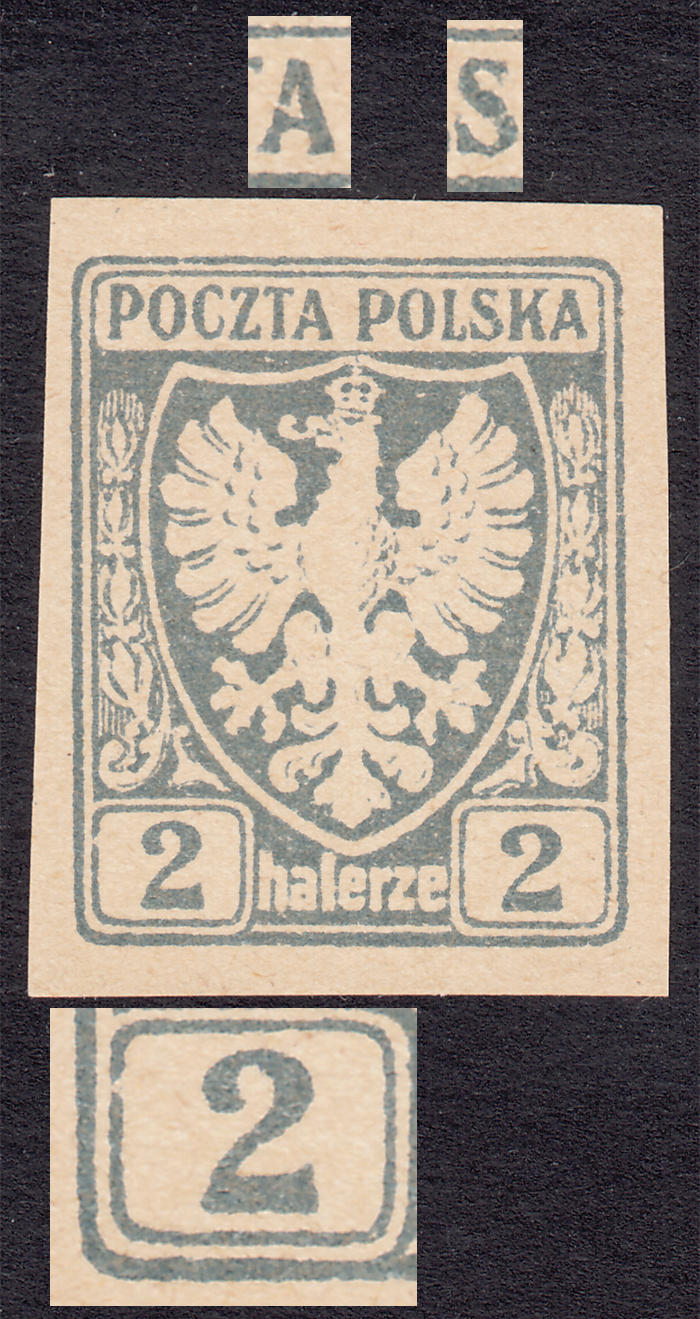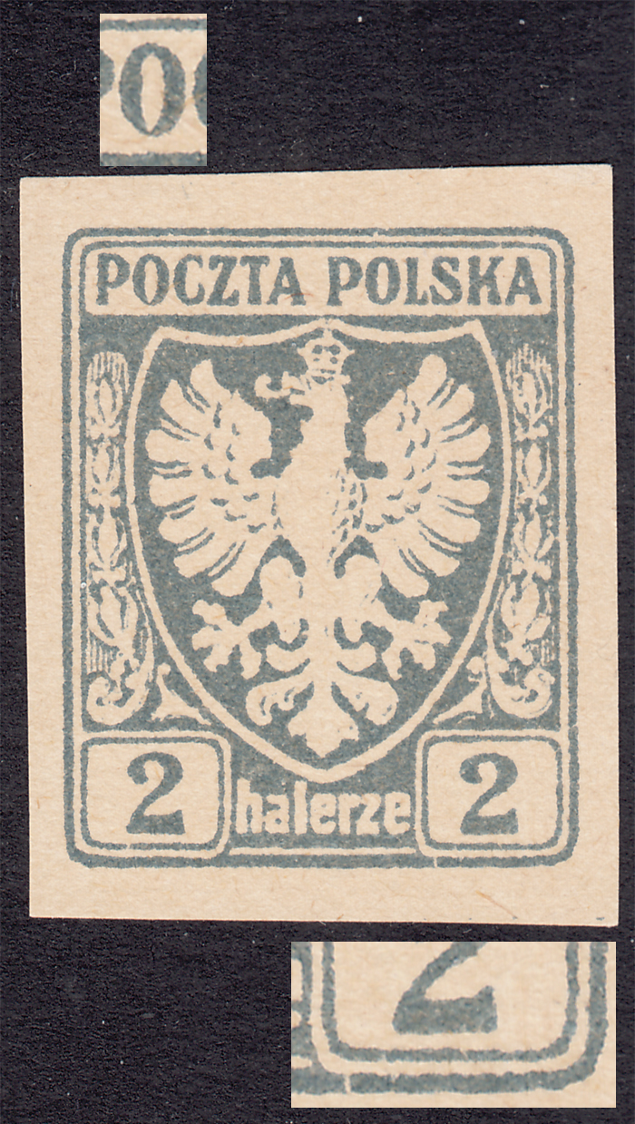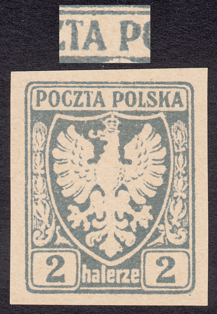 1919 wydanie Komisji Rządzącej, znaczek za 2 h. z niekatalogowanym błędem "duże wcięcie w literze T w POCZTA, małe w literze P w POLSKA oraz w prawej cyfrze 2", gwarancja. | Fi.55 B Mi.54 |