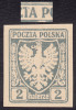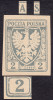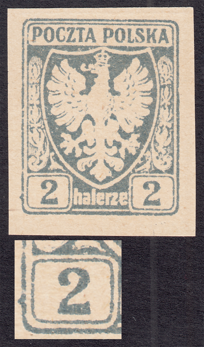1919 wydanie Komisji Rządzącej, znaczek za 2 h. z niekatalogowanymi błędami "przerwana wewnętrzna ramka obok lewej cyfry 2" oraz "przecięta litera A w POCZTA i wyszczerbiona S w POLSKA", gwarancja. | Fi.55 B Mi.54 |