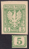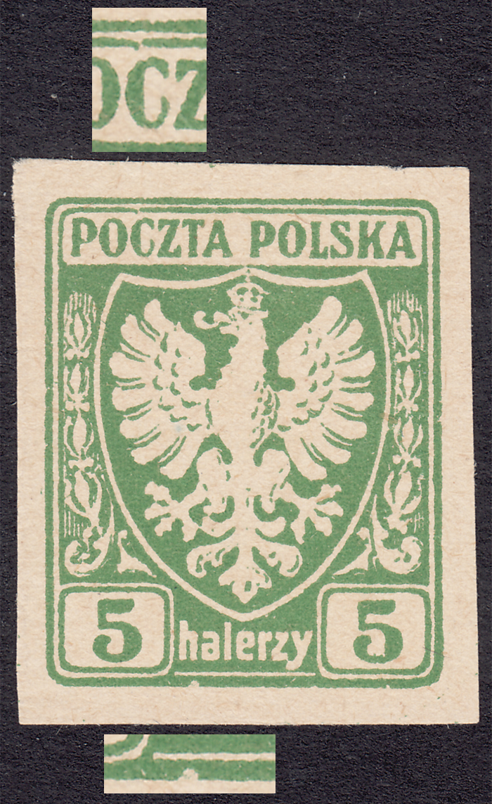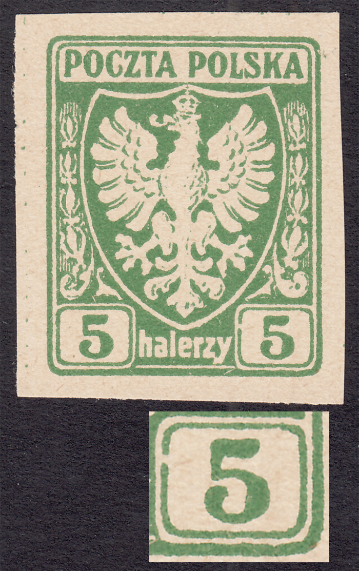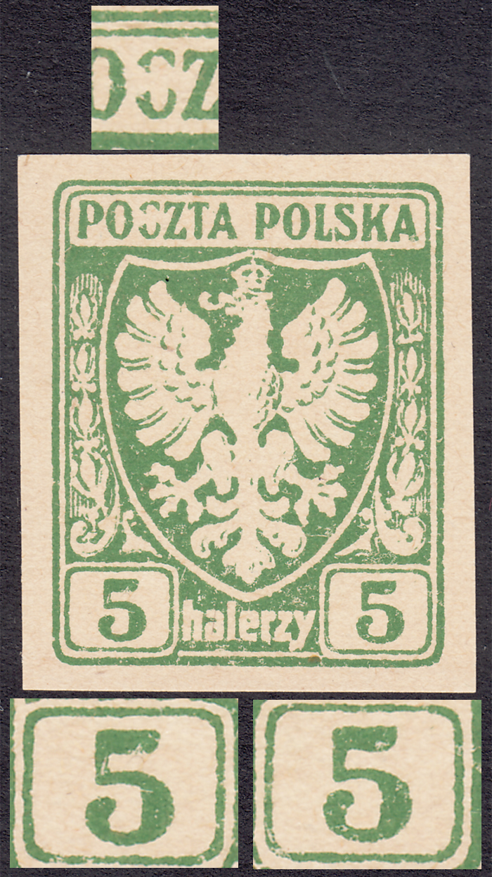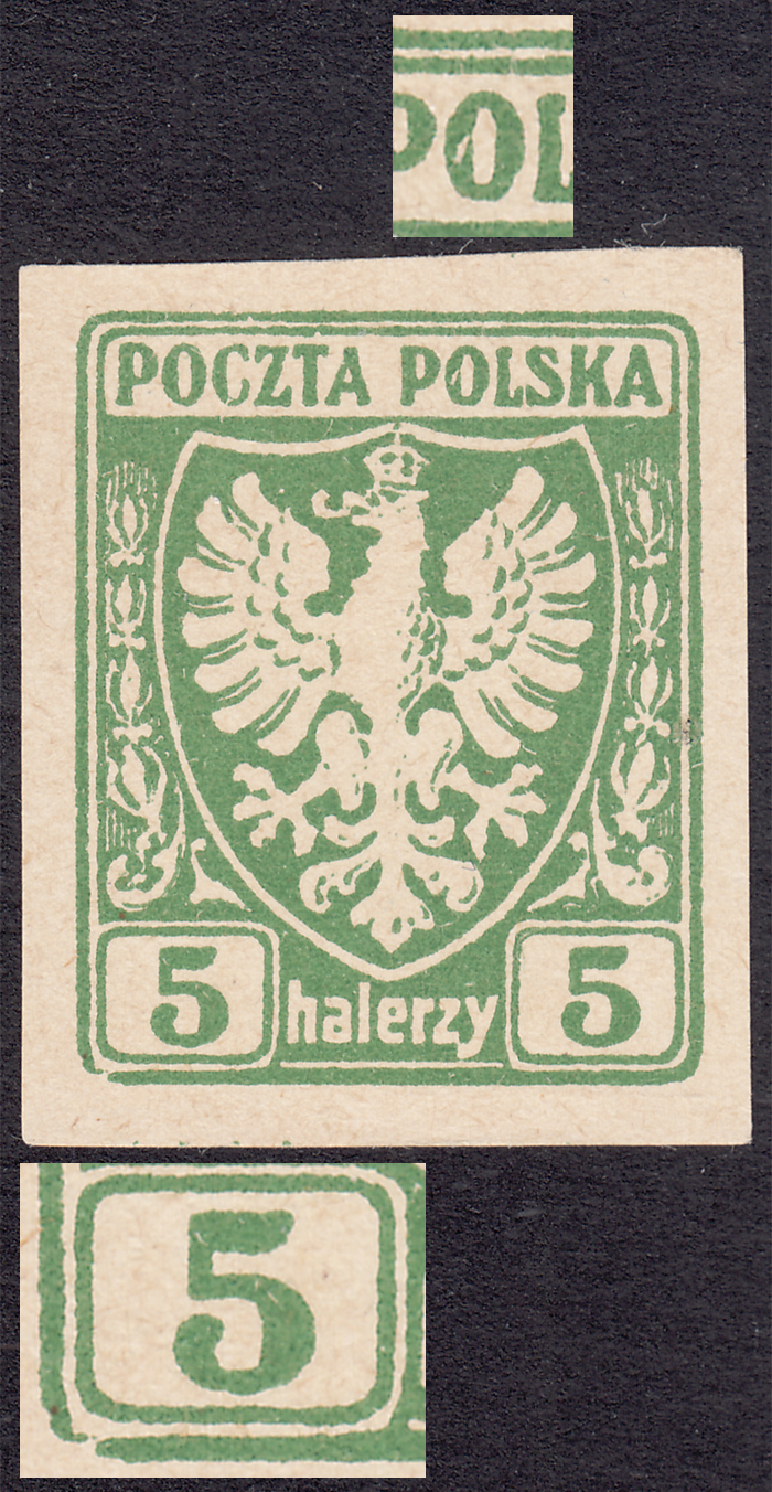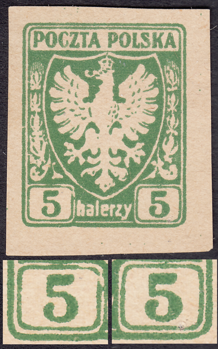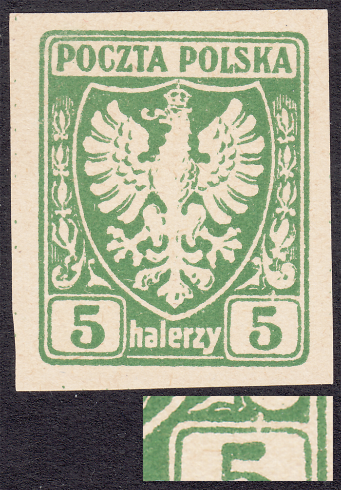 1919 wydanie Komisji Rządzącej, znaczek za 5 h. z niekatalogowanymi błędami "przecięcie w literze O w POLSKA" oraz "pęknięta ramka w lewym narożniku", gwarancja. | Fi.57 B Mi.56 |