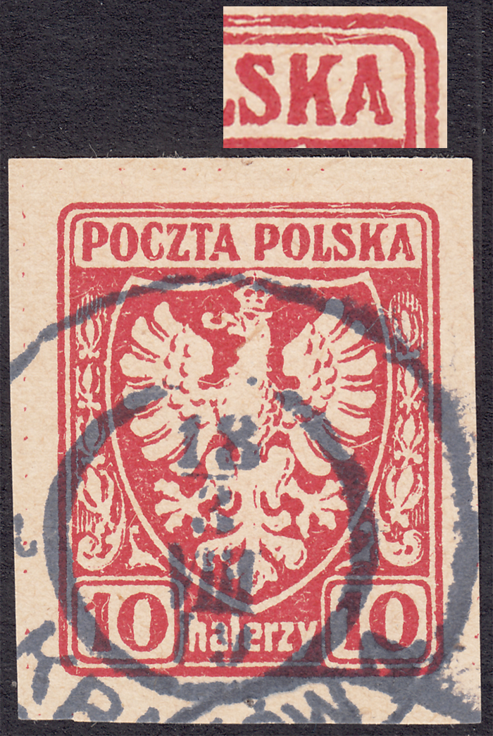 1919 wydanie Komisji Rządzącej, kasowany znaczek za 10 hal. z dwoma niekatalogowanymi błędami "mocno uszkodzona litera A w POLSKA" oraz "liczne pęknięcia w ramkach i innych częściach rysunku", gwarancja Berbeka. | Fi.59 B Mi.58 |
