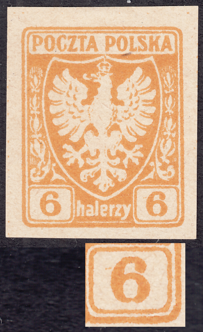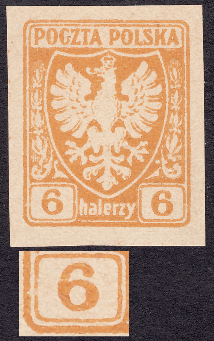 1919 wydanie Komisji Rządzącej, najdroższy w serii znaczek za 6 h. z niekatalogowanym błędem "duże wcięcie w prawej cyfrze 6", gwarancja. | Fi.58 B Mi.57 |