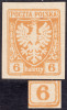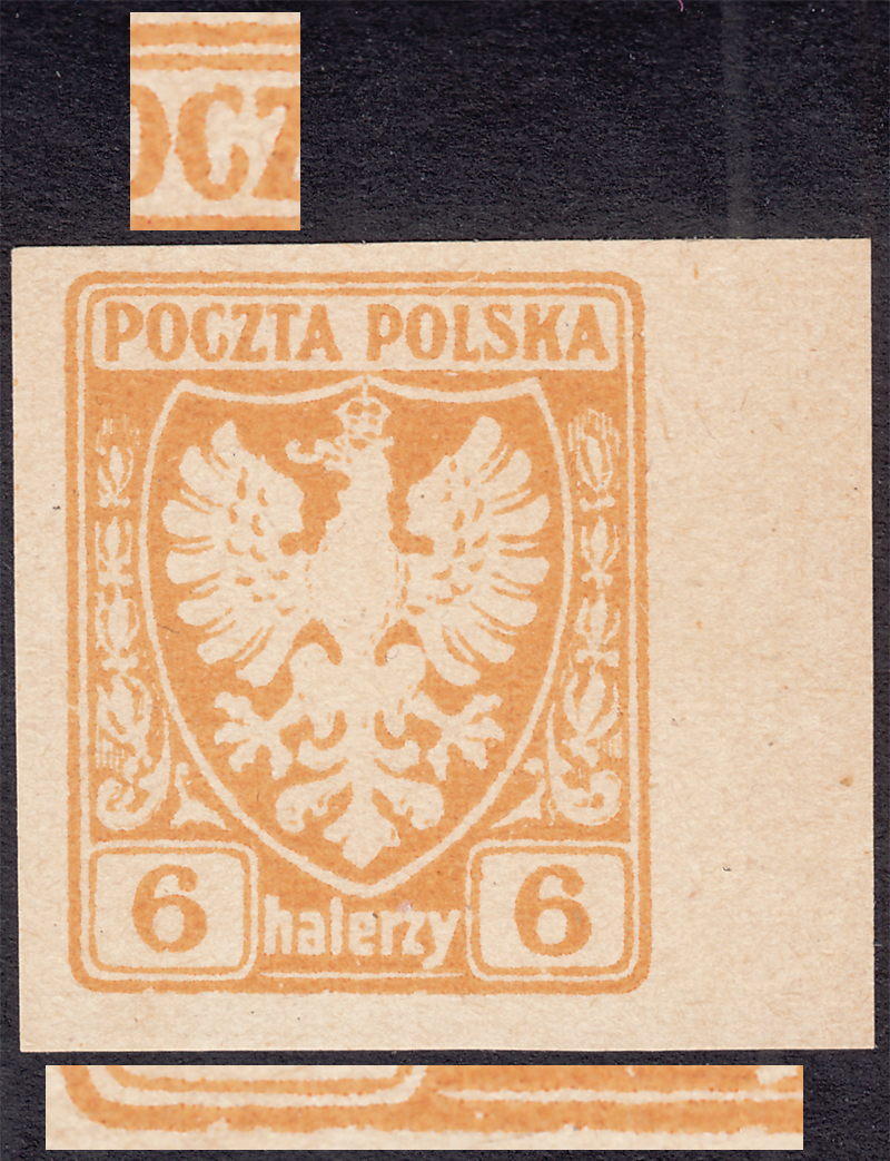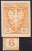 1919 wydanie Komisji Rządzącej, najdroższy w serii marginesowy znaczek za 6 h. z niekatalogowanymi błędami "wcięcie w literze C w POCZTA" i "wcięcia w dolnej krawędzi ramki", gwarancja Schmutz. | Fi.58 B Mi.57 |
