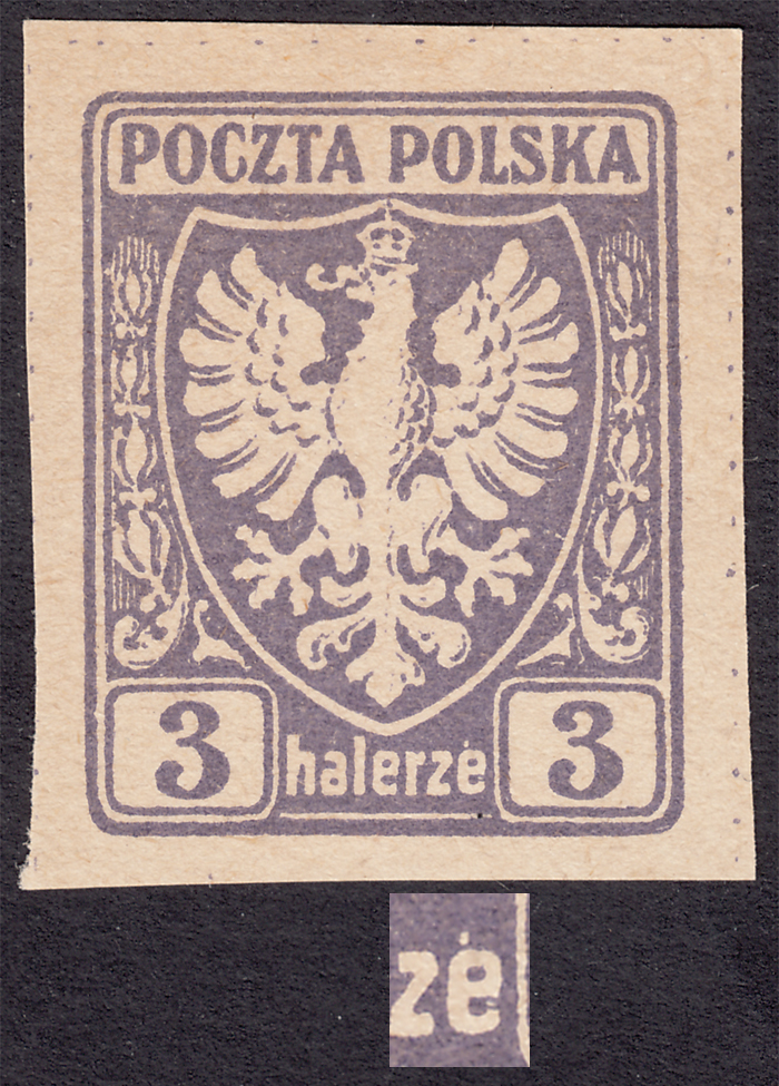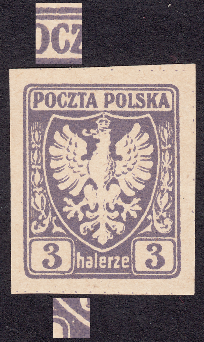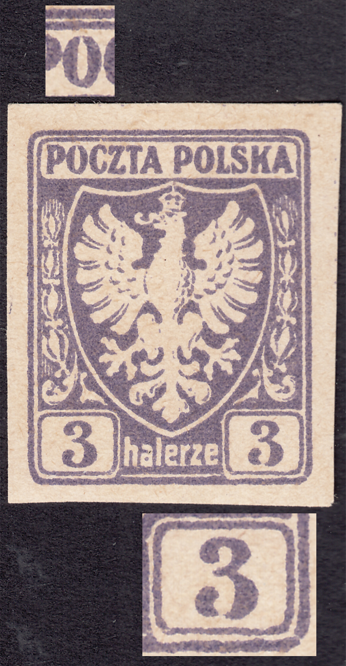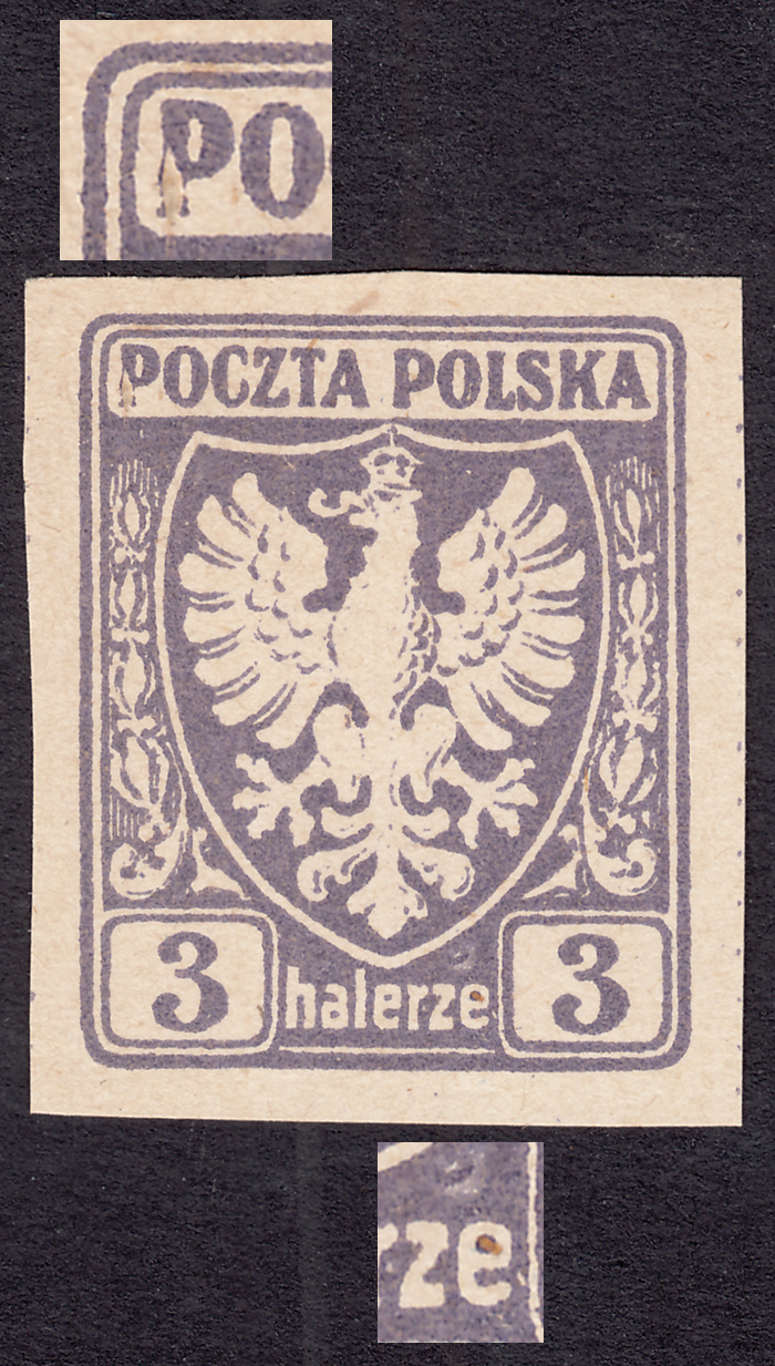 1919 wydanie Komisji Rządzącej, znaczek za 3 h. z niekatalogowanymi błędami "rozszczepiona nóżka litery P w POCZTA" i "plamka nad ze w halerze", gwarancja Walocha. | Fi.56 B Mi.55 |