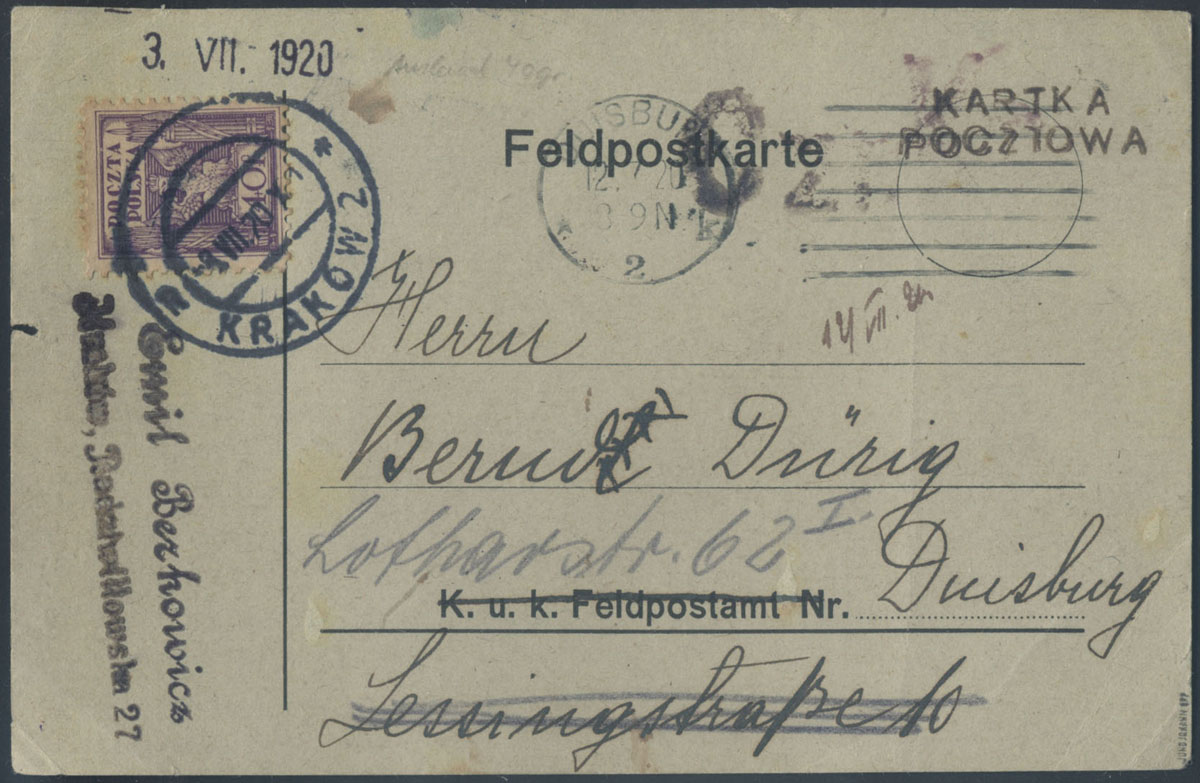 1920 ofrankowany formularz austro-węgierskiej poczty polowej adresowany do Wiednia, datowany 15.4 we Lwowie, treść pisana po niemiecku, ładnie odciśnięty, choć niekompletnie, dwuwierszowy stempelek cenzury lwowskiej w kolorze czerwonym "PRZEGLĄDANO/ WOJSK. DOZÓR POCZT. ...", znaczki nie zostały skasowane (przesyłka być może została zatrzymana przez cenzurę?); bardzo dobry stan zachowania. Adresatem przesyłki jest Karl Völker (1886-1937) urodzony we Lwowie w rodzinie pochodzenia niemieckiego, ale dorastał jako dwujęzyczny, po ukończeniu niemieckiego gimnazjum we Lwowie studiował teologię i filozofię protestancką na uniwersytetach w Wiedniu, Lipsku i Berlinie, był historykiem, teologiem, badaczem dziejów kościoła w Polsce, autor dzieła Kirchengeschichte Polens. | Fi.88B Mi.104 |