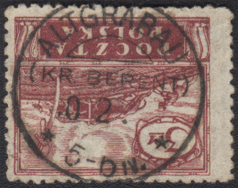 1920 Poczta Polska na Pomorzu, GRABOWO KOŚCIERSKIE - wydanie w walucie markowej, znaczek za 3 mk ładnie skasowanych 10 2 20(?) praktycznie kompletnym kasownikiem prowizorycznym - niemieckim datownikiem agencji pocztowej ALTGRABAU (KR.BERENT); bardzo dobry stan zachowania. | Fi.98 Mi.113 |