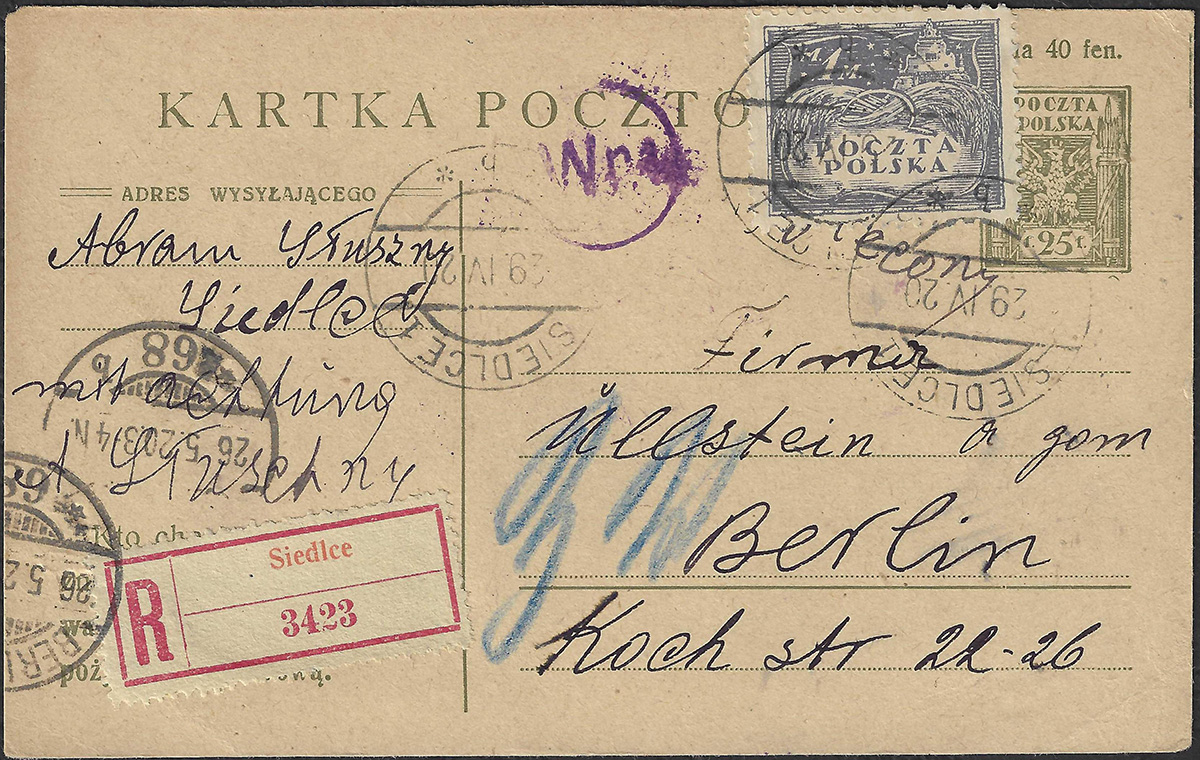 1920 kartka polecona z Siedlec do Niemiec, czerwona erka Siedlec, stempel odbiorczy. | Fi.92B, Cp32 |