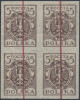 1920 orzeł na tarczy barokowej, czworoblok niegumowanych prób arkuszowych kreślonych czerwonym tuszem, gwarancja Ryblewski. | Fi.118P |