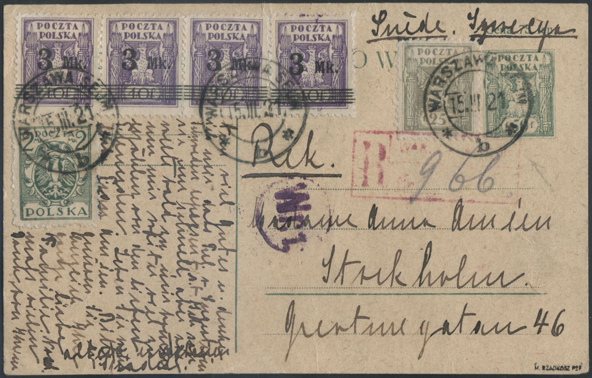 1921 kartka polecona nadana w upt. Warszawa Sejm do Szwecji, stempel warszawskiej cenzury wojskowej, gwarancja Rzadkosz. | Fi.90B, 115, 120, Cp35 |