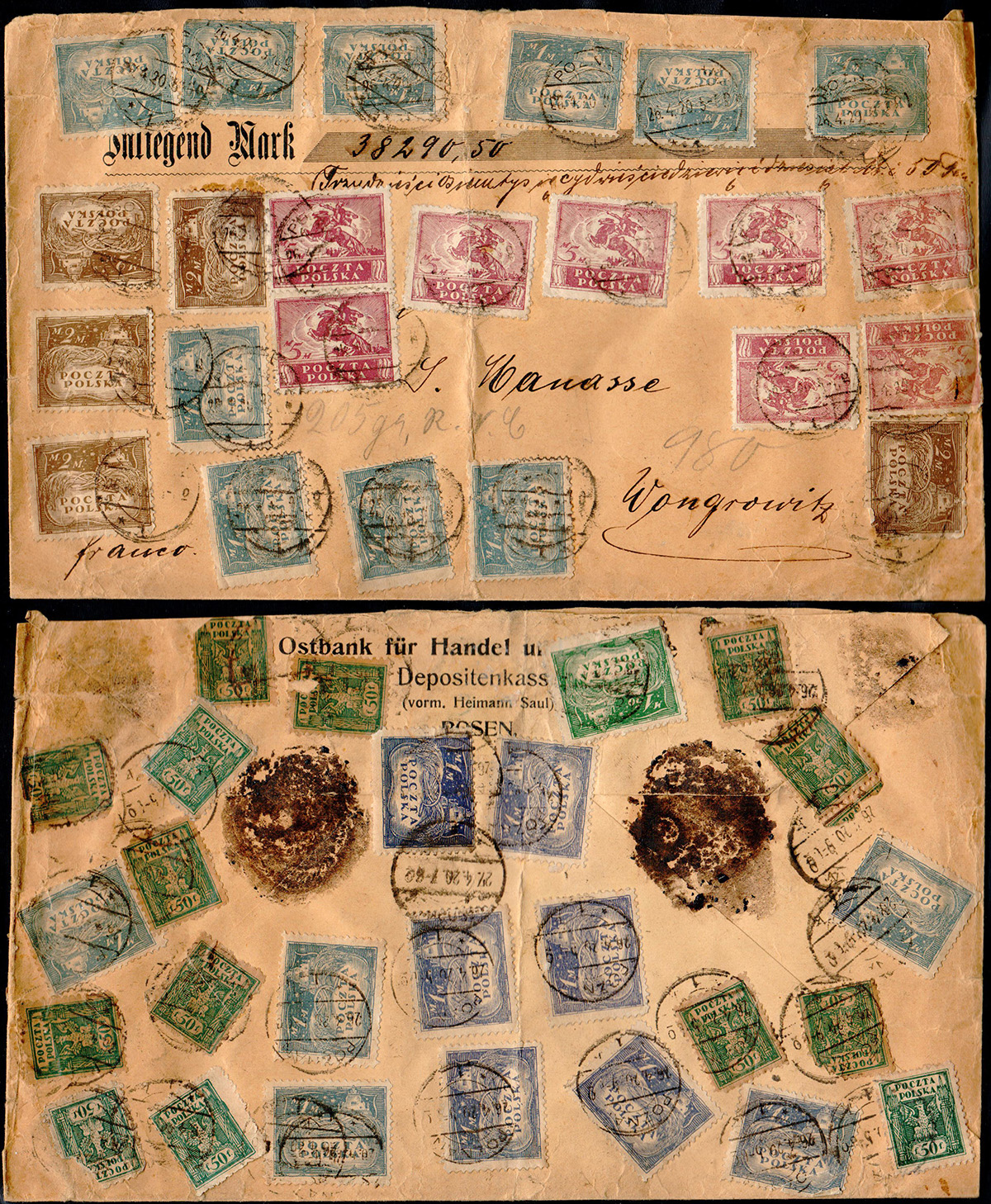 1920 list wartościowy z Poznania nadany 26.04.20 do Wągrowca, bardzo wysoka opłata 79,50 Mk zgodna z taryfą obowiązującą od 15.04.20, list opłacono 48! znaczkami co zdarza się przy hiperinflacji z 1923-24 roku, unikat. | |