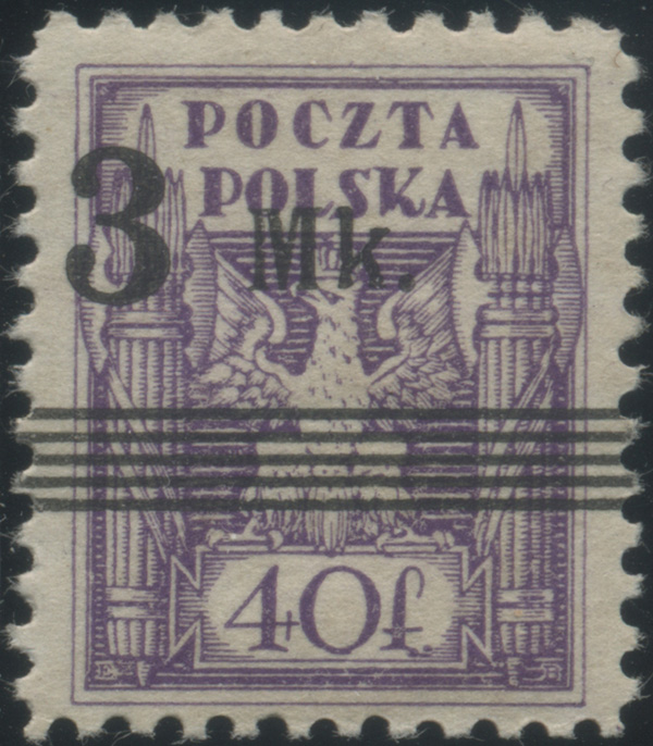 1921 wydanie przedrukowe, znaczek za 3 Mk./40 fen. typu I z nadrukiem podwójnym, jedna podlepka, podwójna gwarancja Schmutz. | Fi.120I Np Mi.153DD |