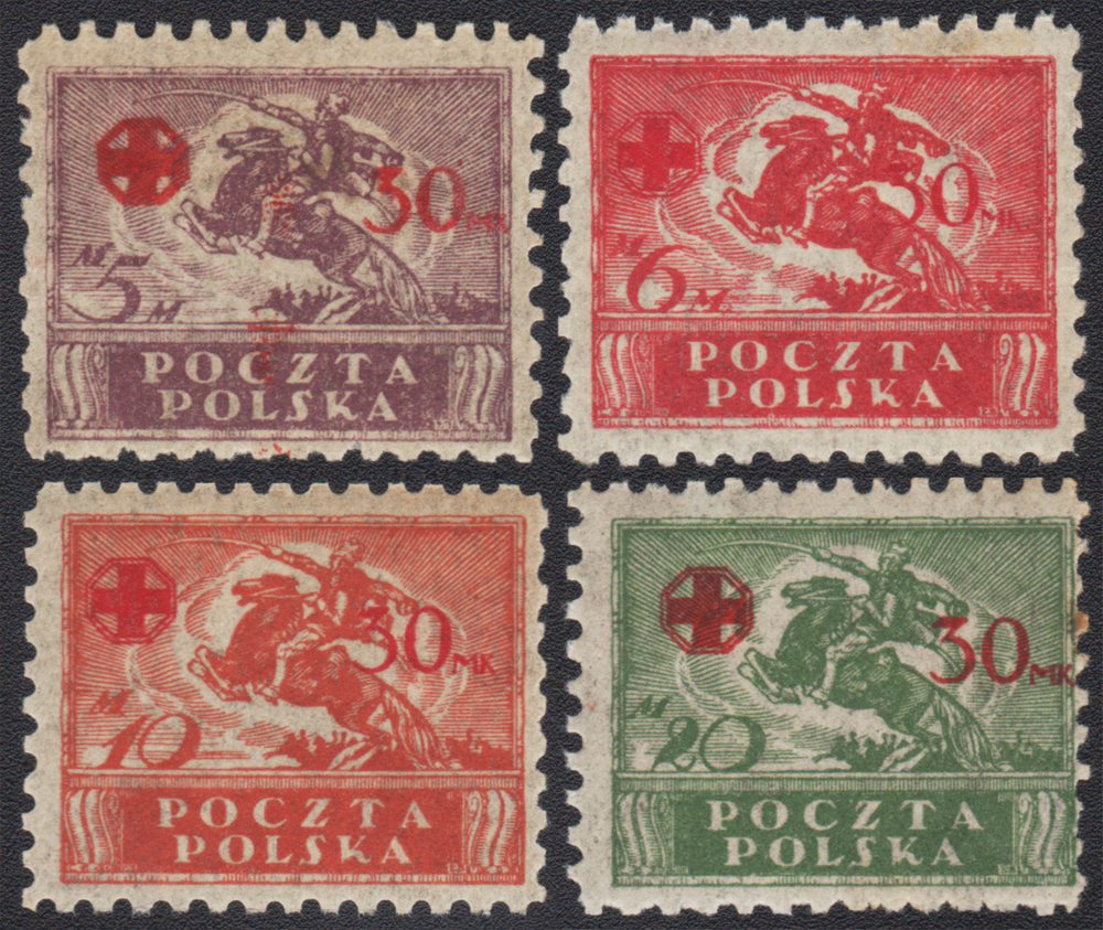 1921 wydanie z dopłatą na Polski Czerwony Krzyż, seria czysta z oryginalną gumą w dobrym stanie (Fi.600.-), ostatni znaczek gwarancja. | Fi.121-24a Mi.154-57 |
