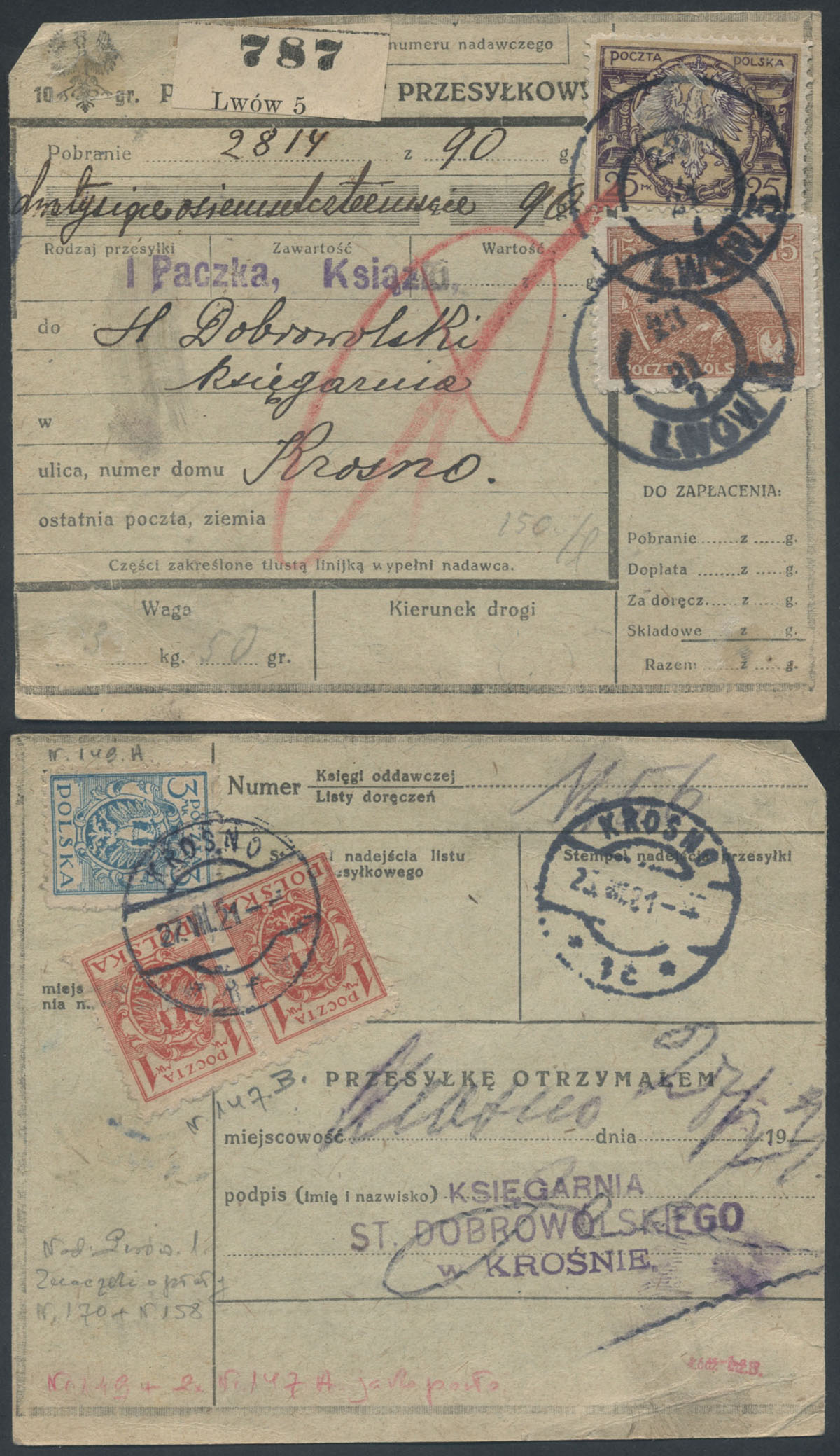 1921 przekaz paczkowy z Lwowa do Krosna, opłaty doręczeniowe pobrane znaczkami opłaty. | Fi.114, 116,126, 135 |