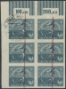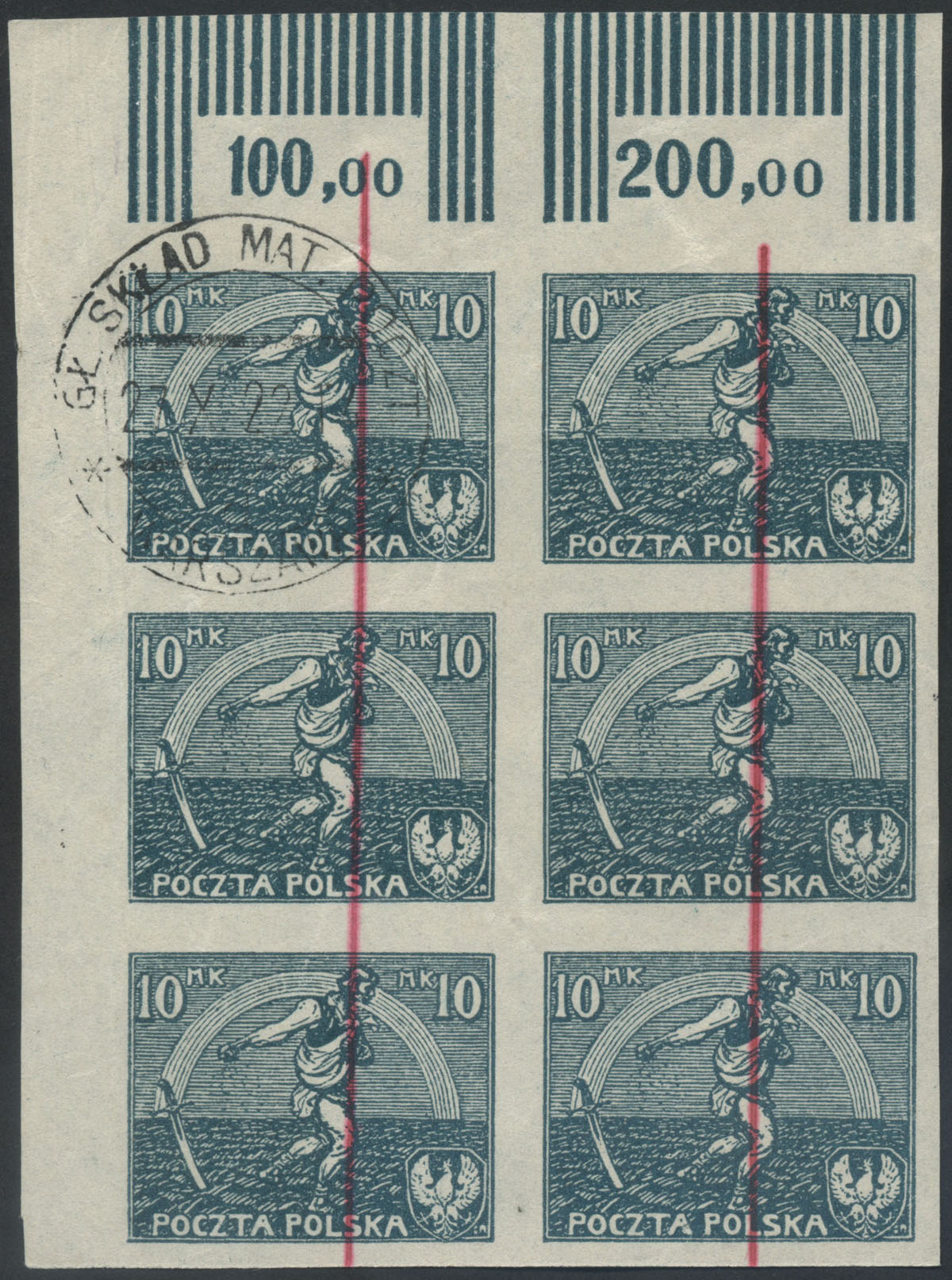 1921 siewca, narożny sześcioblok niegumowanych prób arkuszowych kreślonych czerwonym tuszem, stempel Głównej Składnicy Materiałów Pocztowych w Warszawie, gwarancja Ryblewski. | Fi.125IP |