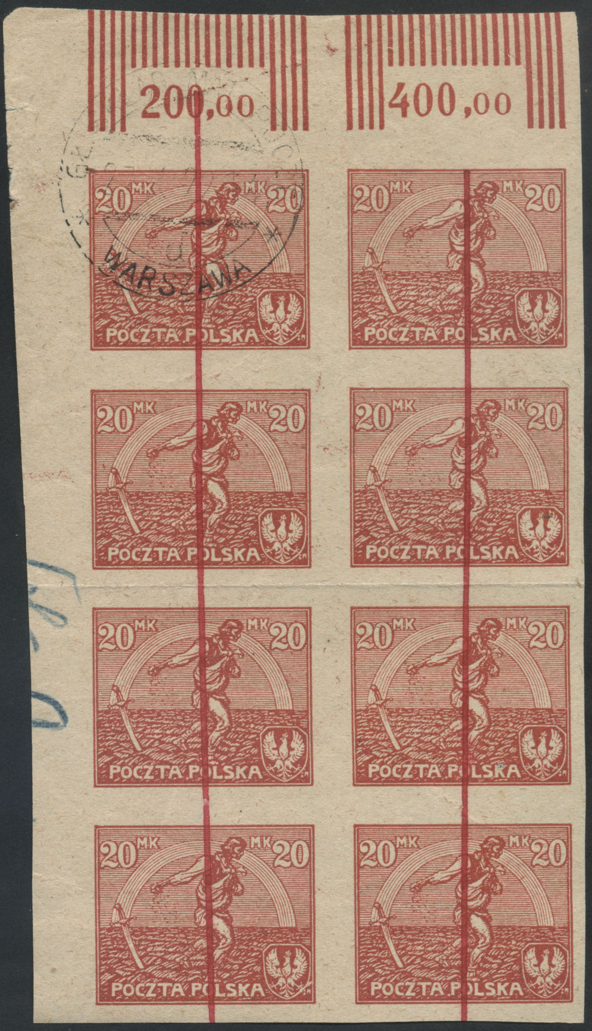 1921 siewca, narożny ośmioblok niegumowanych prób arkuszowych kreślonych czerwonym tuszem, stempel Głównej Składnicy Materiałów Pocztowych w Warszawie, gwarancja Ryblewski. | Fi.127IIP |