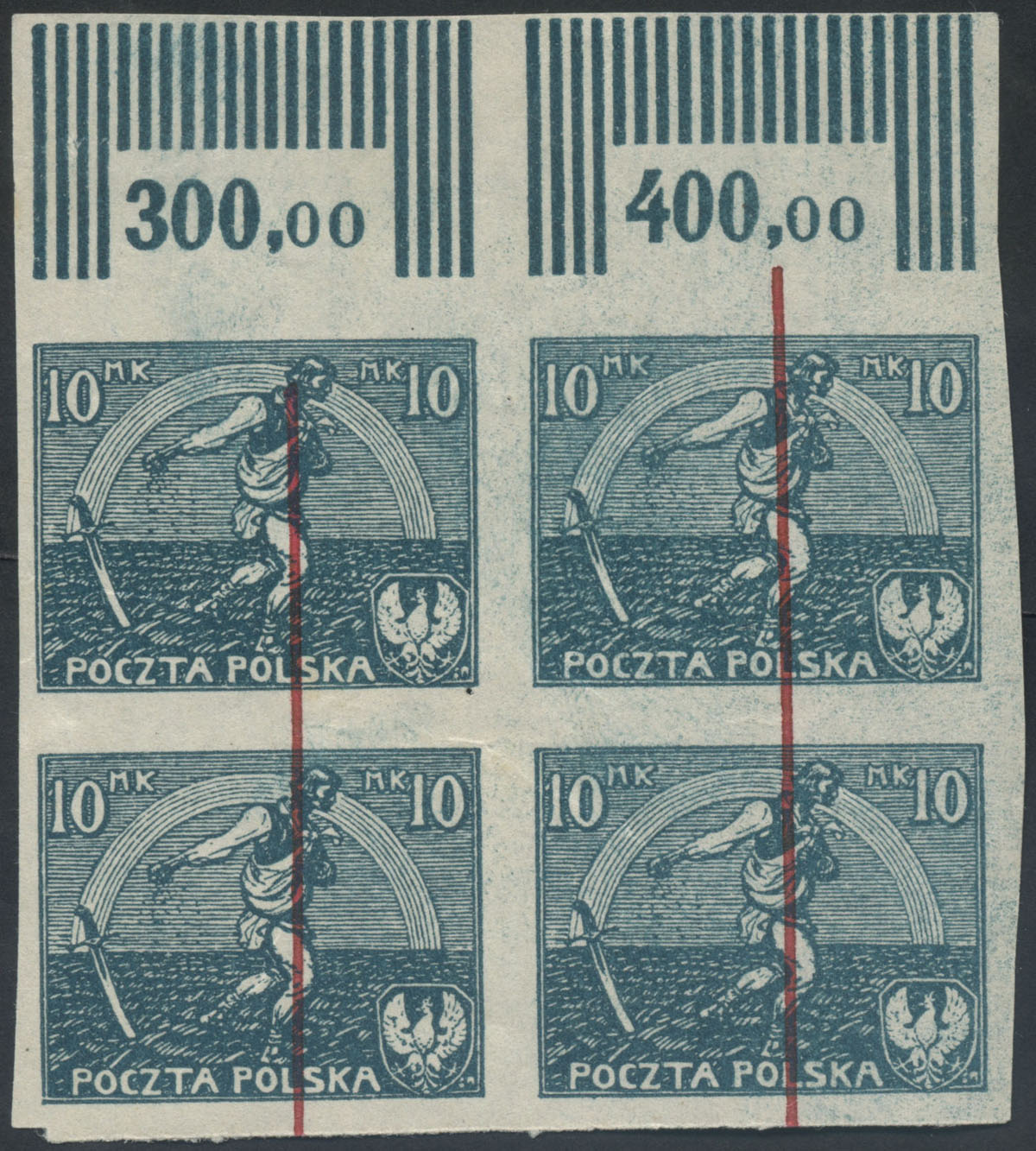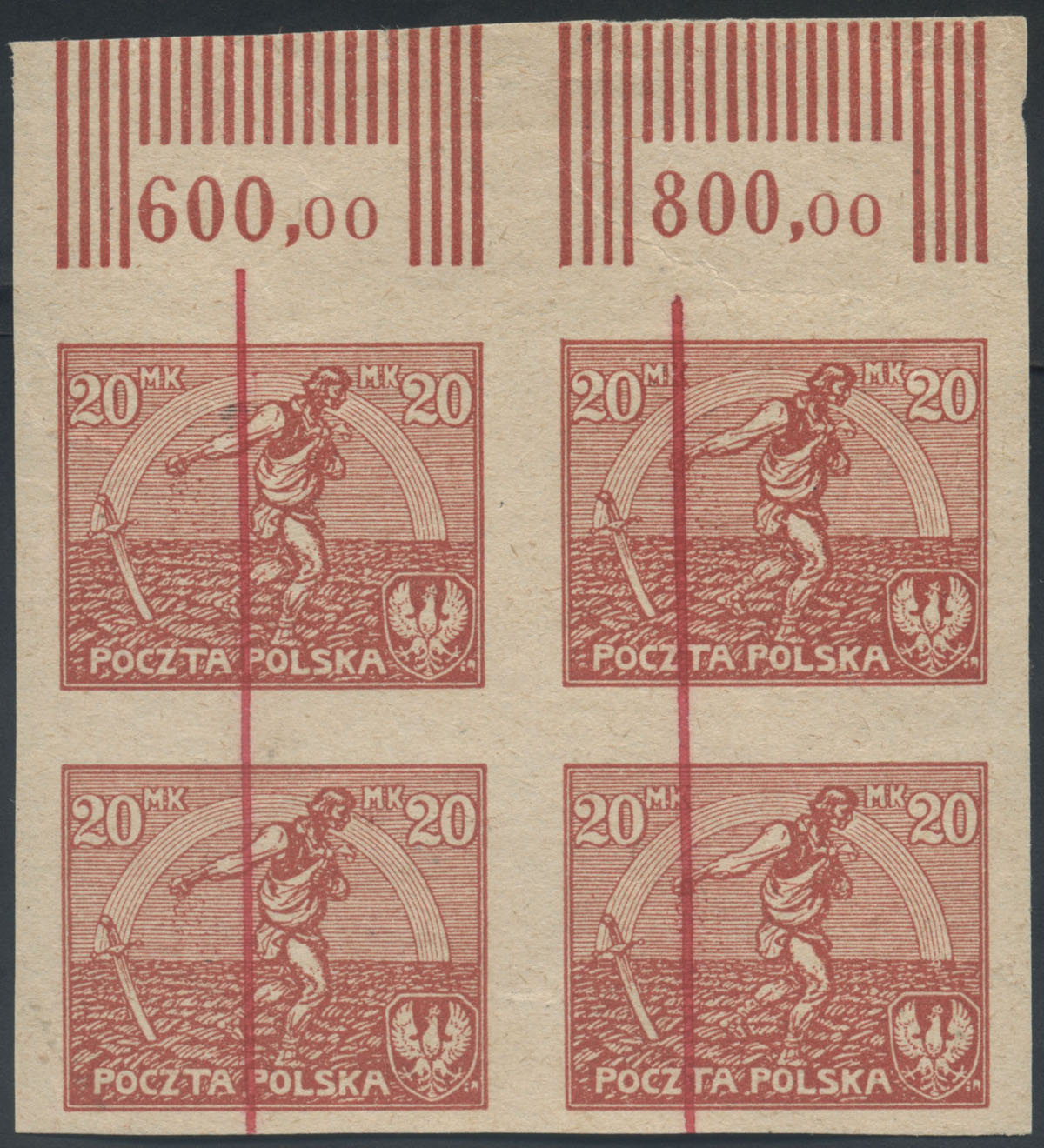 1921 siewca, marginesowy czworoblok niegumowanych prób arkuszowych kreślonych czerwonym tuszem, gwarancja Ryblewski. | Fi.127IIP |