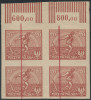 1921 siewca, marginesowy czworoblok niegumowanych prób arkuszowych kreślonych czerwonym tuszem, gwarancja Ryblewski. | Fi.125IP |
