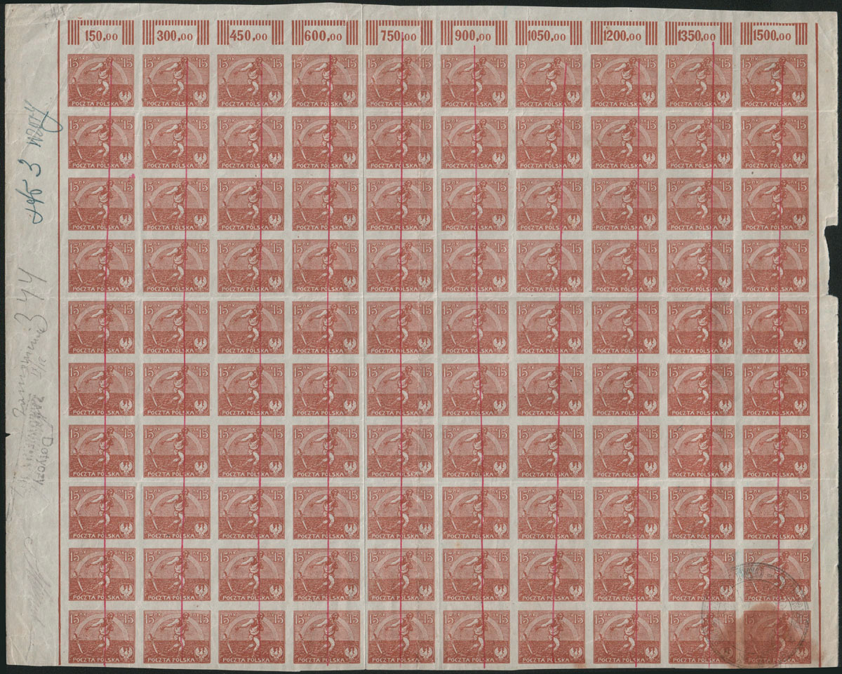 1921 siewca, kompletny arkusz niegumowanych prób kreślonych czerwonym tuszem, w dolnym prawym rogu pieczęć Ministerstwa Skarbu, również w tym rogu dwa zażółcone znaczki od zalania, arkusz w kilku miejscach zagięty, unikalny walor w tej postaci. | Fi.126P ark. |