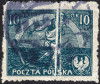 1921 duży orzeł na tarczy barokowej, parka z podwójną perforacją poziomą na górnym marginesie - MK 2. Górny margines przeząbkowany - dodatkowe uderzenie grzebienia nastąpiło na marginesie, grzebień ustawiony do góry nogami. | Fi.137MK2 Mi.173 |