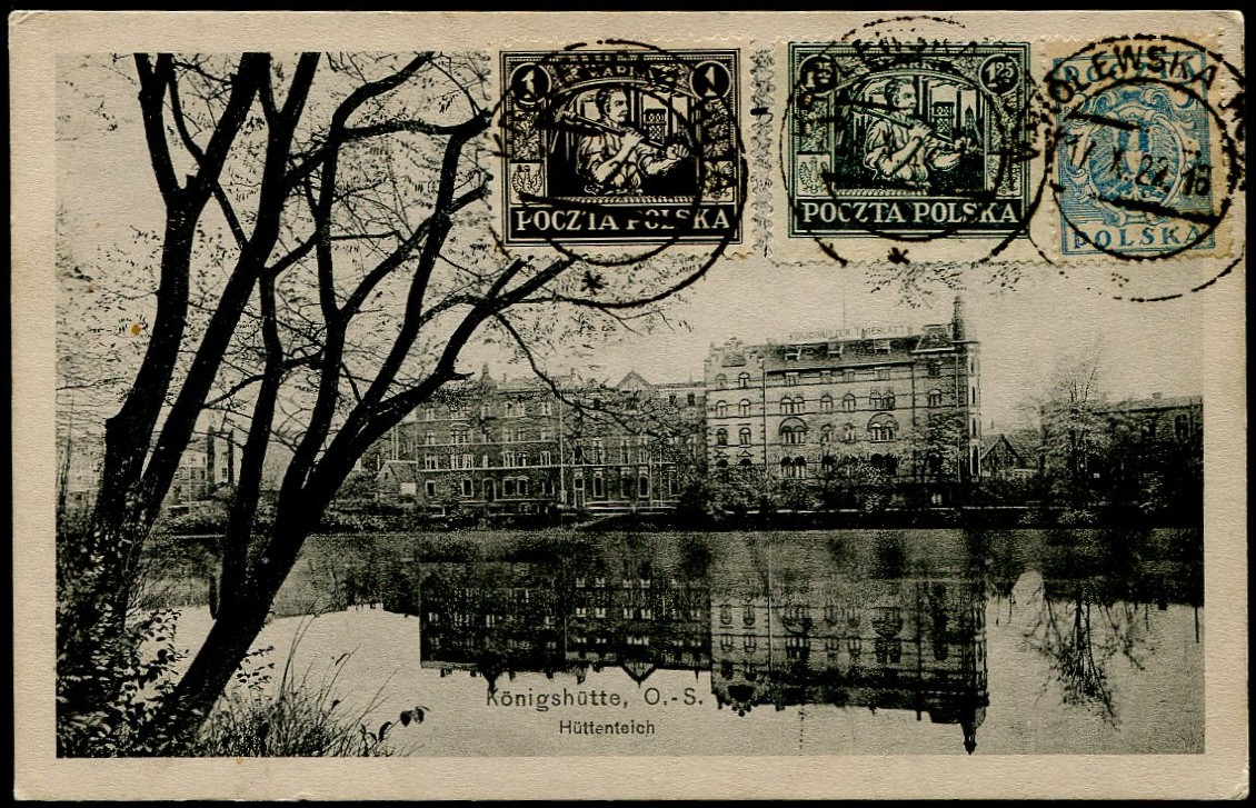 1922 wydanie dla Górnego Śląska, znaczki ostemplowane kasownikiem Królewskiej Huty na miejscowej widokówce, bez obiegu pocztowego. | Fi.144,150,151 |