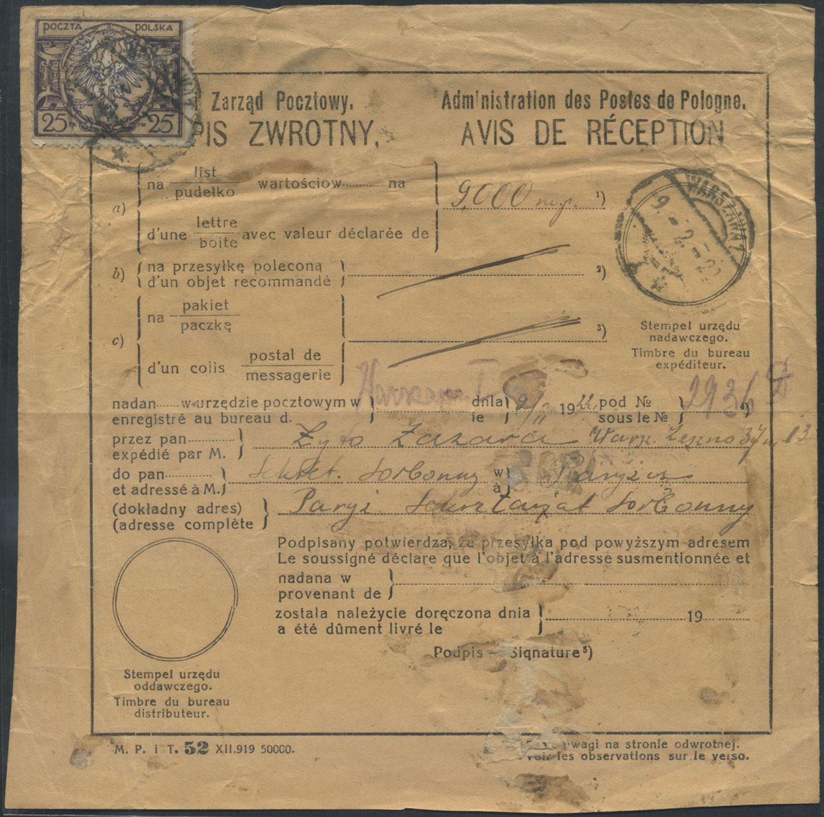 1922 zwrotne poświadczenie odbioru listu poleconego z Francji do Warszawy. | Fi.135 |