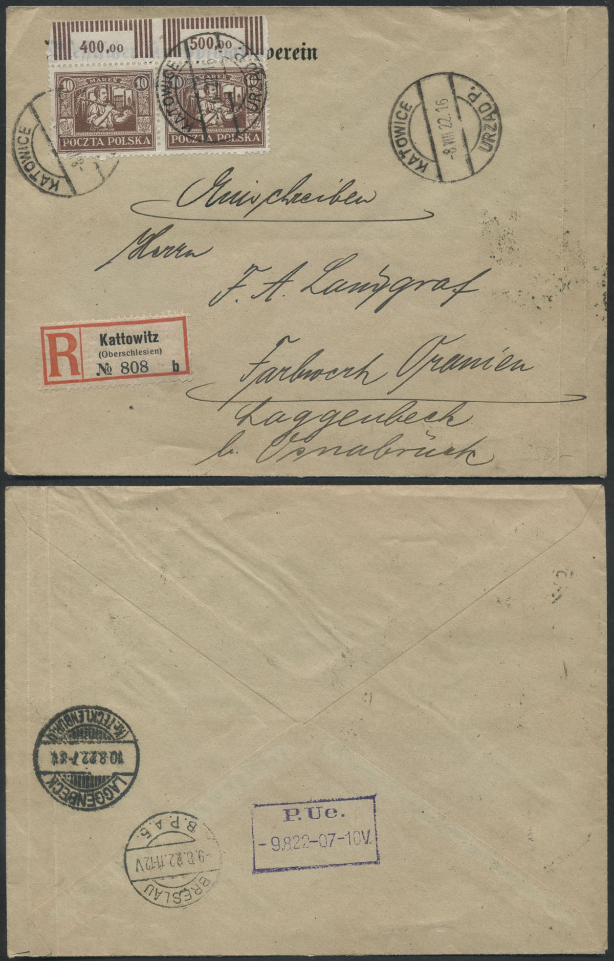 1922 wydanie dla Górnego Śląska, list polecony z Katowic do Niemiec, na odwrocie stemple tranzytowe i stempel odbiorczy. | Fi.157 |