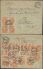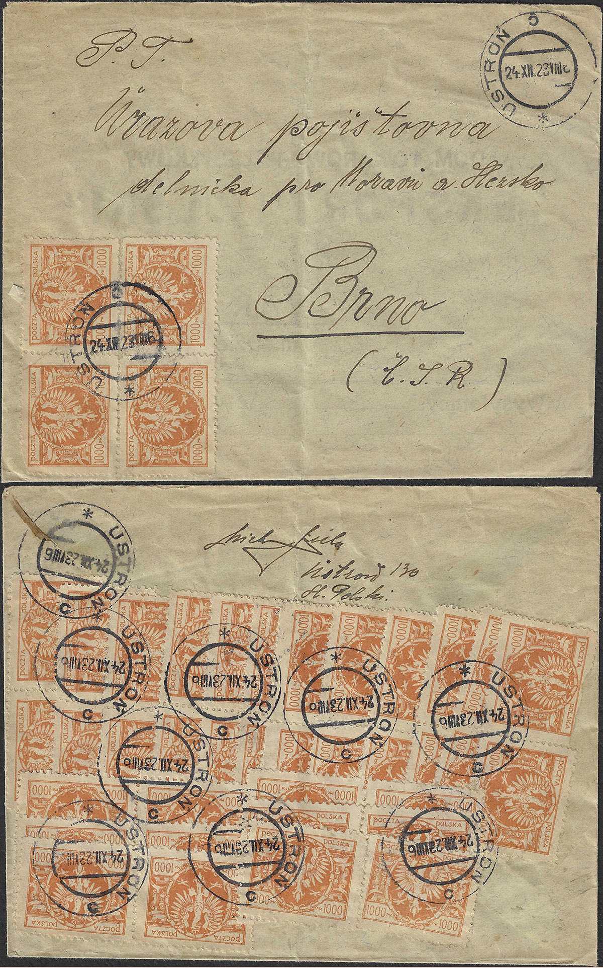 1923 hiperinflacja, list z Ustronia nadany 24.12.23 do Czechosłowacji, opłata 40 znaczkami po 1.000,- mk klejonymi na zakładkę. | Fi.142 |
