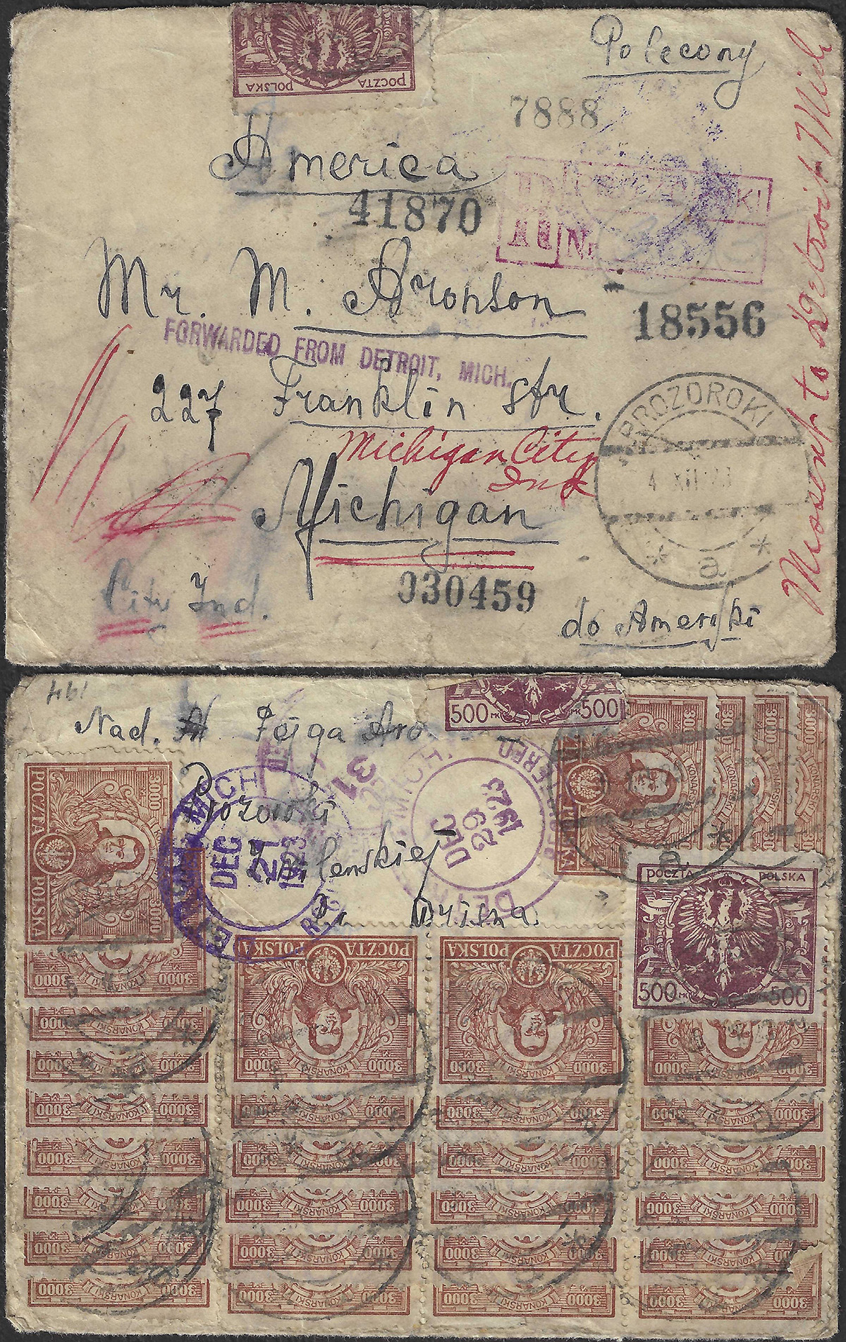 1923 hiperinflacja, list polecony z Prozoroki nadany 4.12.23 do Stanów Zjednoczonych, znaczki klejone na zakładkę. 30 szt. znaczka Fi 165. | Fi.141, 165 |