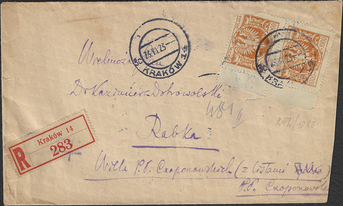 1923 hiperinflacja, list polecony nadany z Krukienic (Kresy - obwód lwowski) 5.11.23 do Lwowa, znaczki za 500 mk ((40! sztuk) klejone na odwrocie koperty na zakładkę, stary austriacki kasownik rusztowy. | Fi.141, 143 Mi.179, 181 |