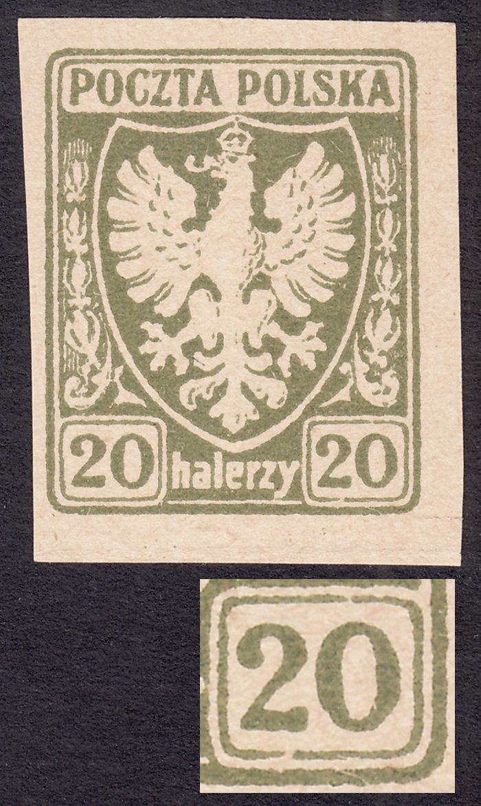 1919 wydanie Komisji Rządzącej, znaczek za 20 hal. z niekatalogowanym błędem "w dwu miejscach przerwana ramka wokół prawej 20", gwarancja. | Fi.61 B Mi.60 |