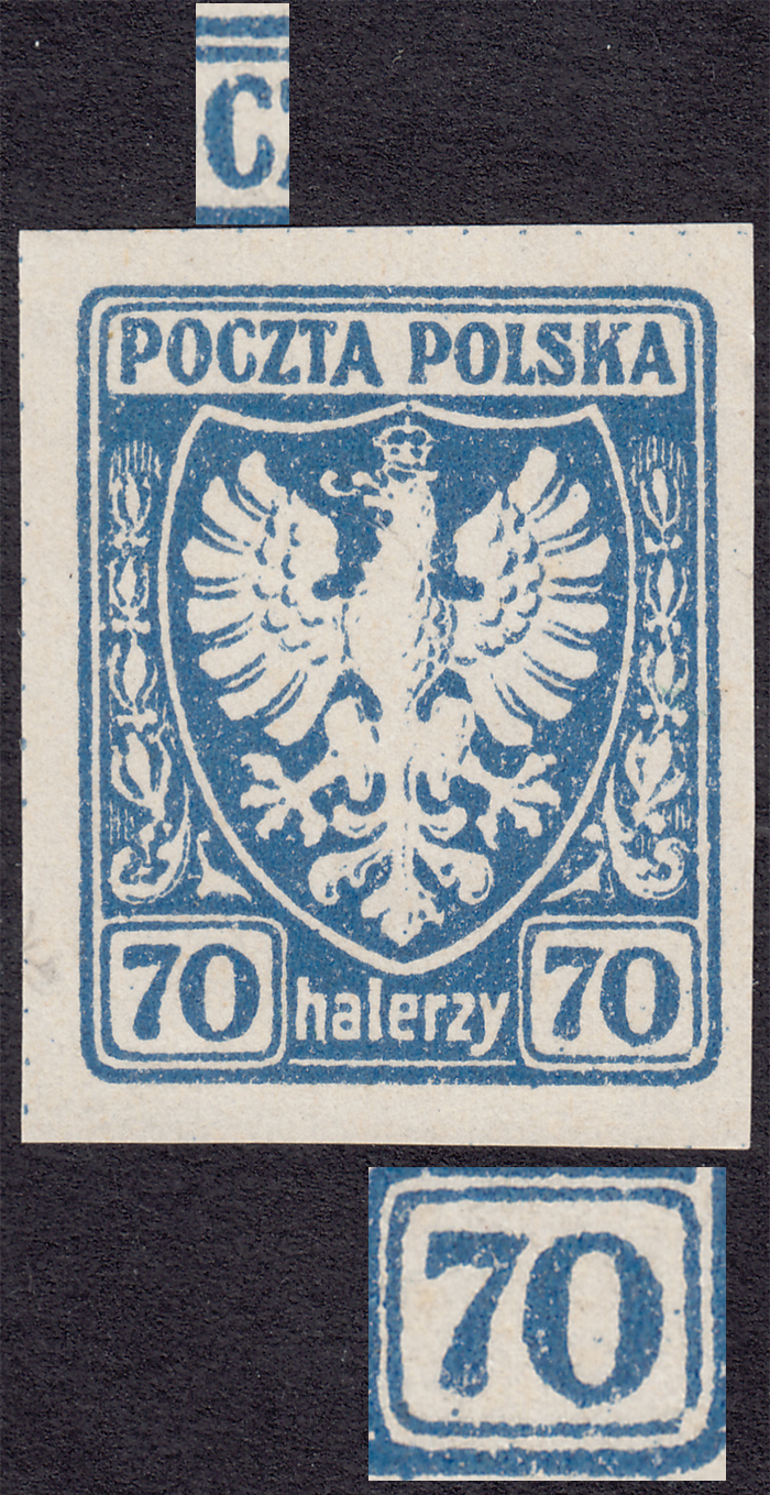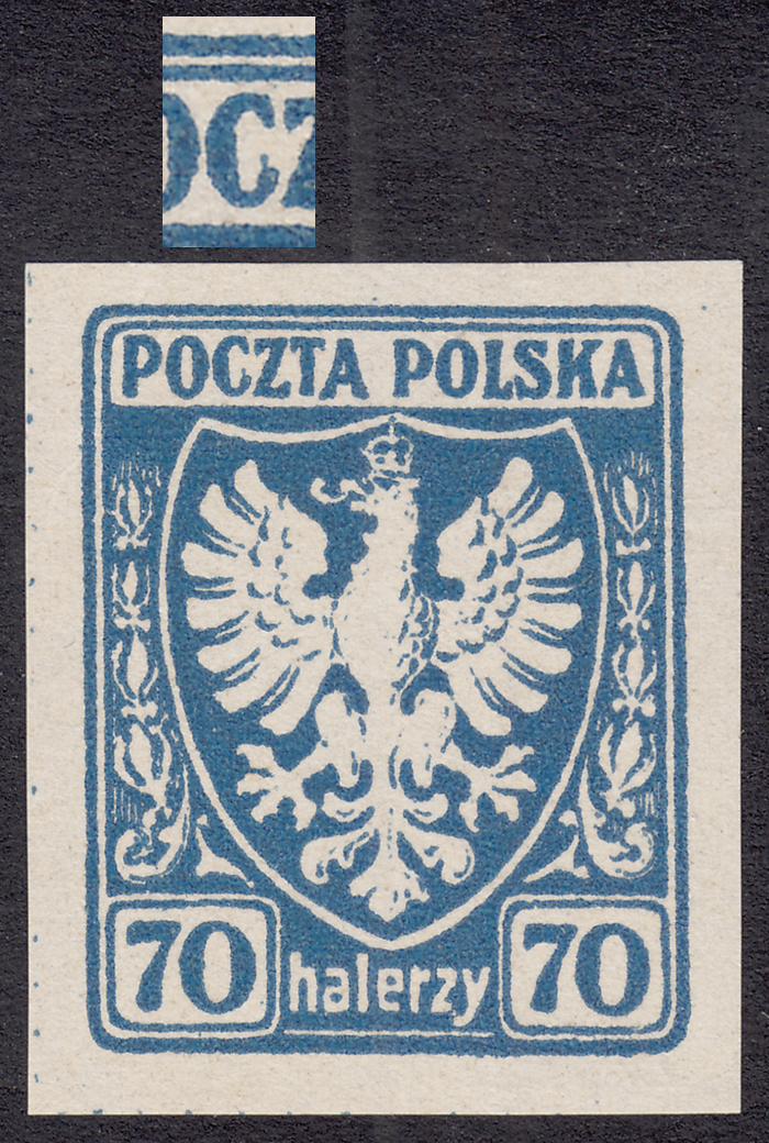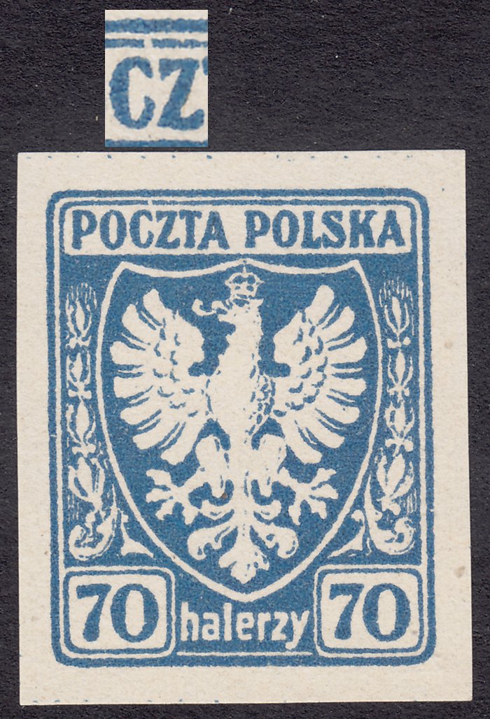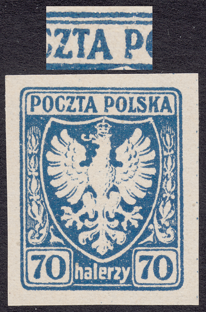 1919 wydanie Komisji Rządzącej, znaczek za 70 hal. z niekatalogowanymi błędami "litera Z w POCZTA przecięta" oraz "litera P w POLSKA wcięta pod brzuszkiem", gwarancja. | Fi.64 B Mi.63 |