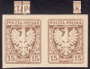 1919 wydanie Komisji Rządzącej, parka znaczków za 15 hal. na obu niekatalogowane błędy: na lewym "odłamana lewa strona poprzeczki litery T w POCZTA" oraz "kropka w P w POLSKA", a na prawym "litera K w POLSKA zniekształcona jak H", gwarancja Berbeka. | Fi.60 B Mi.59 |