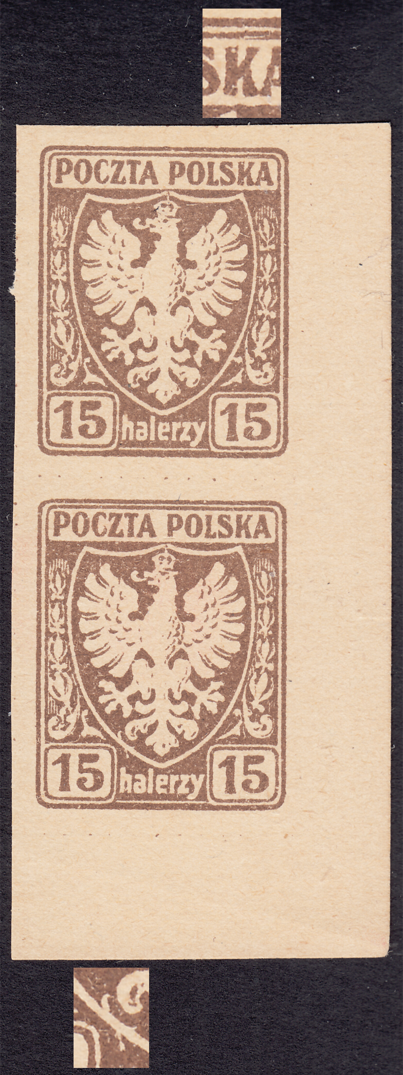 1919 wydanie Komisji Rządzącej, pionowa marginesowa parka znaczków za 15 hal. na obu niekatalogowane błędy: na górnym "kropka w literze K w POLSKA", a na dolnym "przecięty brzeg tarczy", gwarancja Landre, Berbeka. | Fi.60 B Mi.59 |