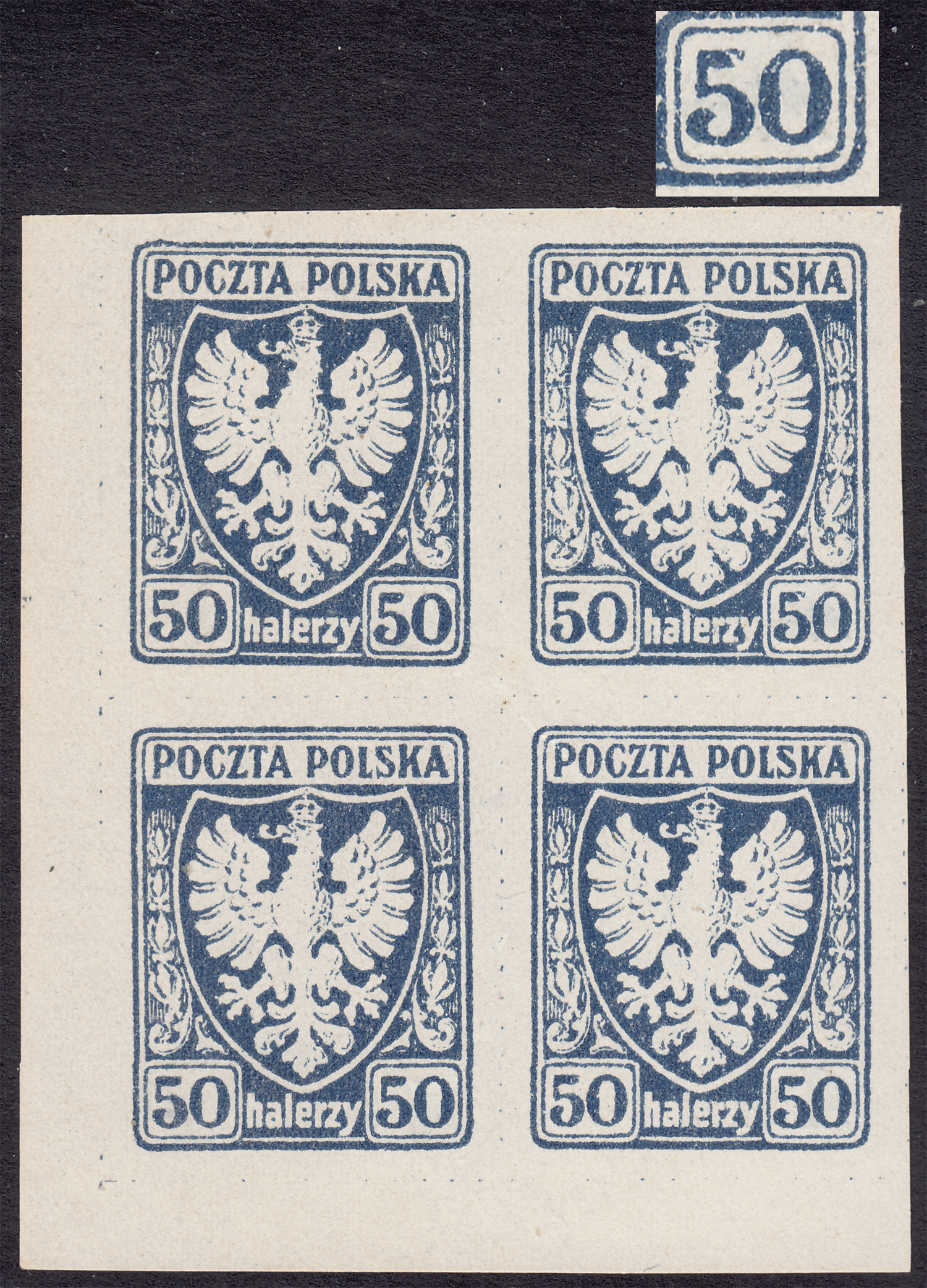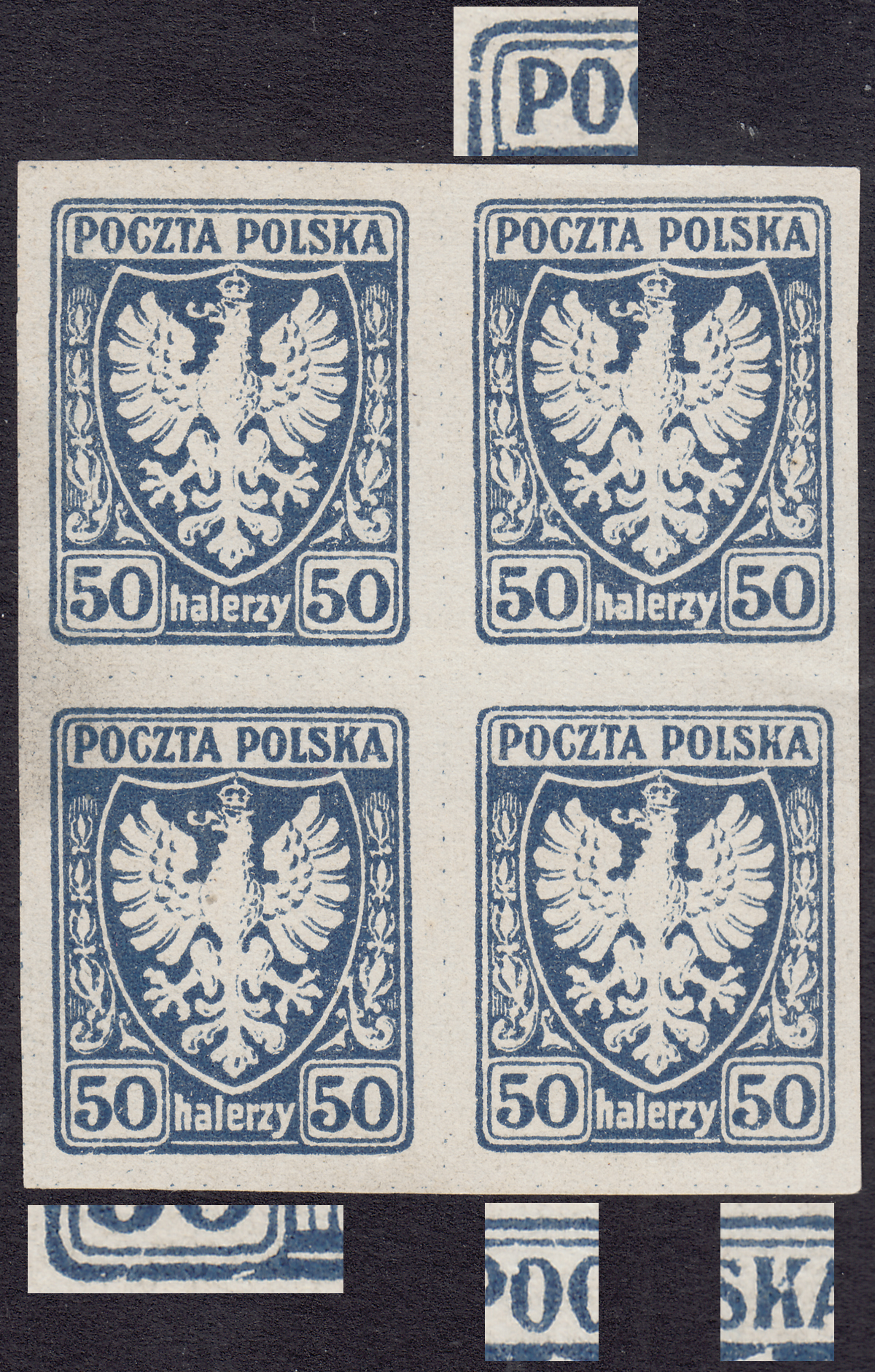 1919 wydanie Komisji Rządzącej, czworoblok znaczków za 50 h., prawy górny z niekatalogowanym błędem "pęknięcie ramki po lewej", prawy dolny z błędami "szczerba w literze O w POLSKA" i "dziurka w literze K W POLSKA, a lewy dolny z "niewielkie wcięcia w dolnej ramce", gwarancja. | Fi.63 B Mi.62 |