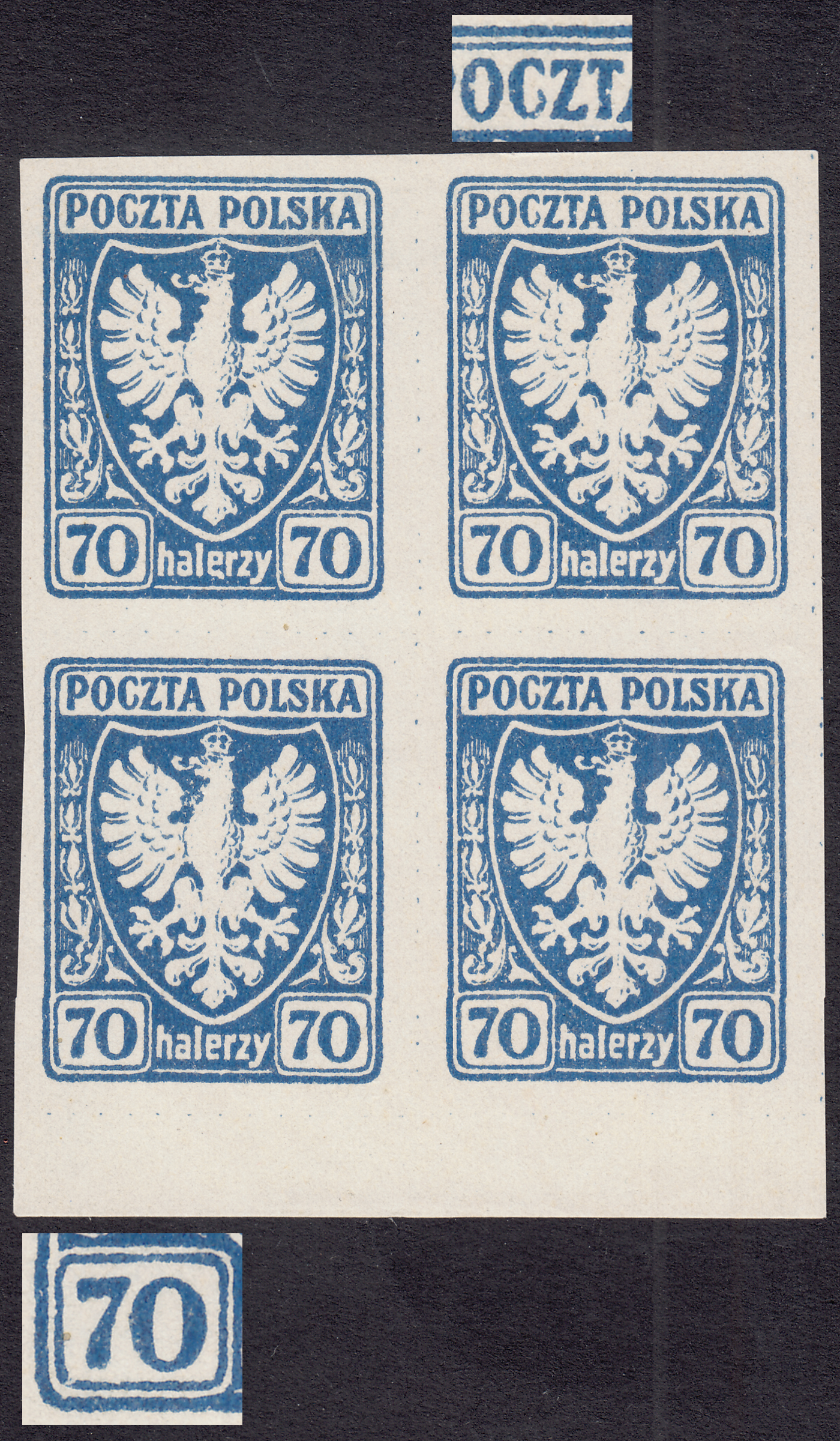 1919 wydanie Komisji Rządzącej, marginesowyy czworoblok znaczków za 70 h. z dwoma niekatalogowanymi błędami, prawy górny z błędem "wcięcia w literach O i T w POCZTA", a lewy dolny z błędem "przerwana obwódka liczby 70 po lewej", gwarancja Berbeka. | Fi.64 B Mi.63 |