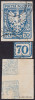 1919 wydanie Komisji Rządzącej, znaczek za 70 hal. z niekatalogowanymi błędami "wcięcie w literze C", "uszkodzona ramka wokół prawej 70" oraz "kropki pod literą S i cyfrą ", gwarancja Berbeka. | Fi.64 B Mi.63 |