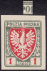 1919 wydanie Komisji Rządzącej, znaczek za 1 kr. z niekatalogowanym błędem "uszkodzona litera O w POLSKA", dodatkowo lekkie przesunięcie koloru czerwonego w lewo, gwarancja Berbeka. | Fi.65 B Mi.64 |