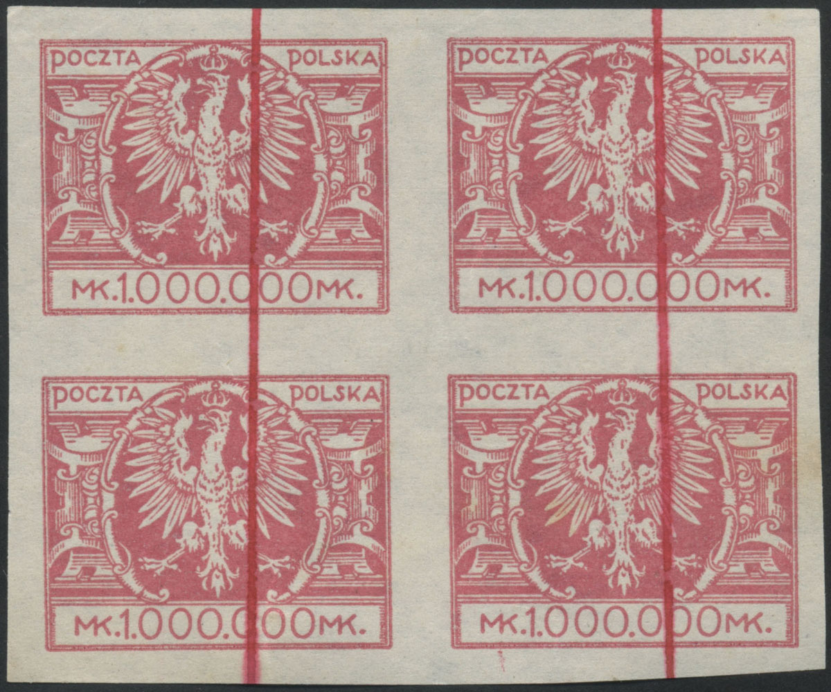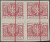 1924 duży orzeł na tarczy barokowej, czworoblok niegumowanych ciętych prób arkuszowych kreślonych czerwonym tuszem, gwarancja Ryblewski. | Fi.180P |
