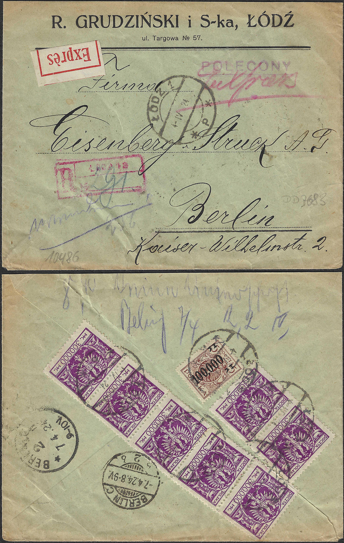 1924 hiperinflacja, firmowy list polecony z Poznania nadany 13.03.24 do Niemiec, wysoka taryfa inflacyjna 1.100.000 mk, na odwrocie stempel odbiorczy, gwarancja Petriuk. | Fi.177, 178 Mi.196, 197 |