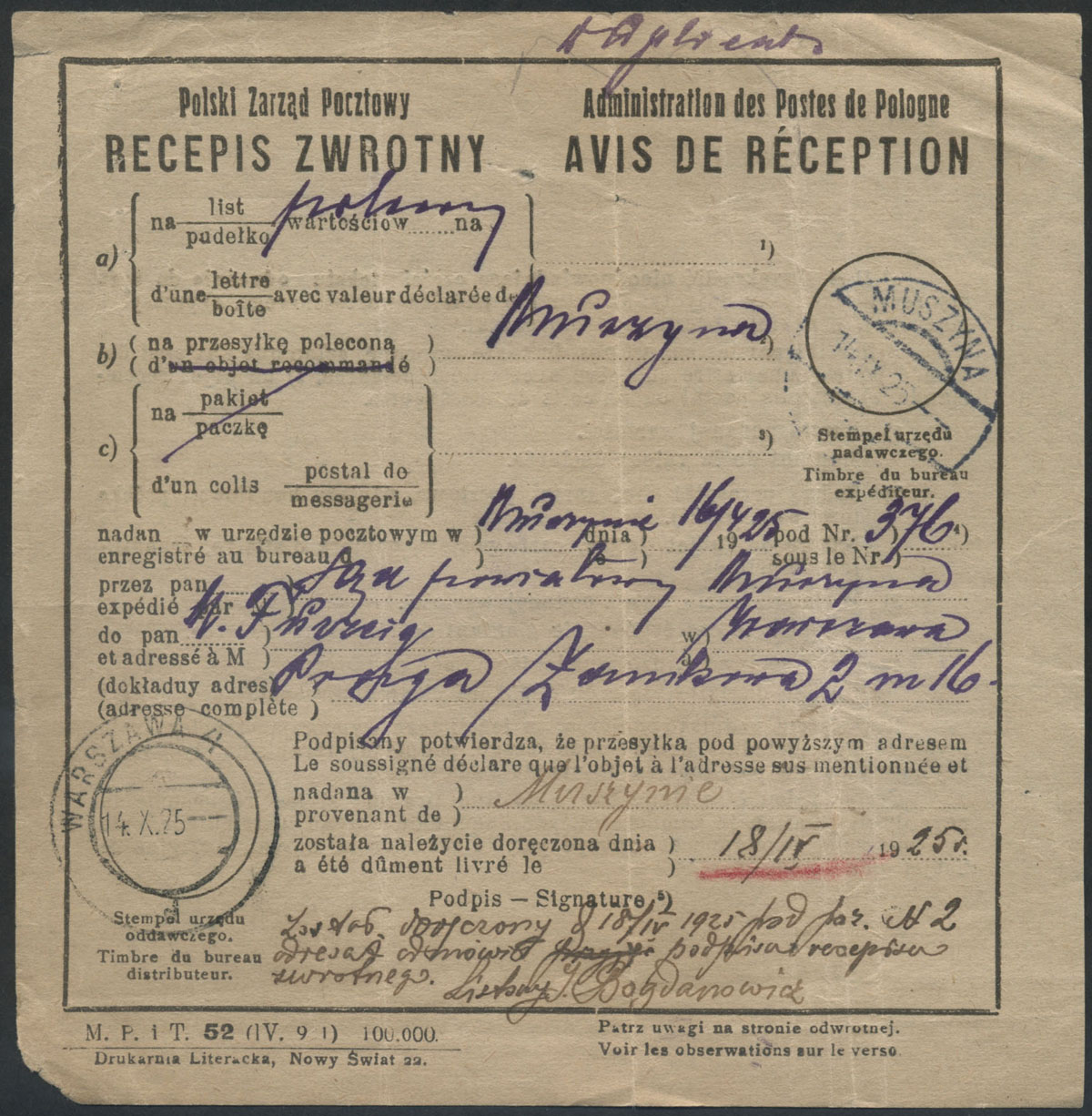 1925 zwrotne poświadczenie odbioru listu poleconego z Muszyny do Warszawy. | |