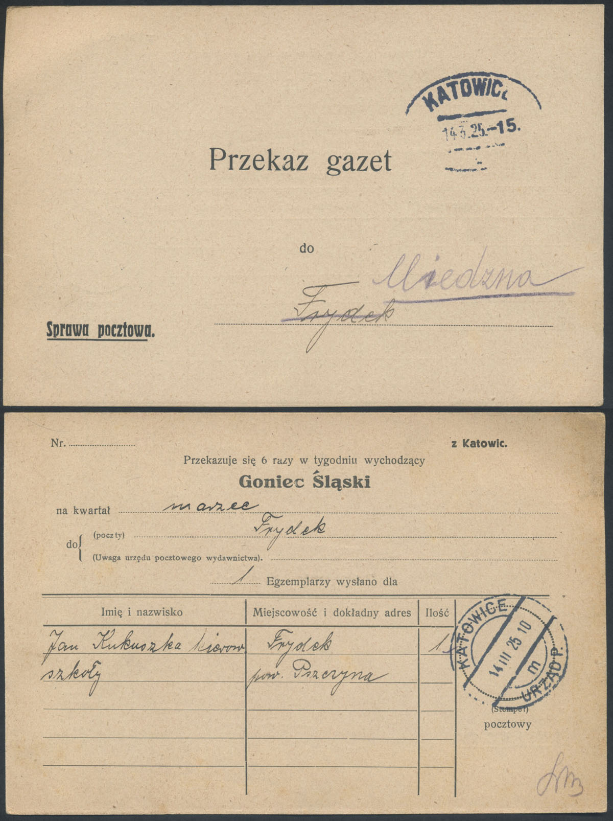 1925 formularz sprawa gazetowa z Katowic do Miedźna. | |