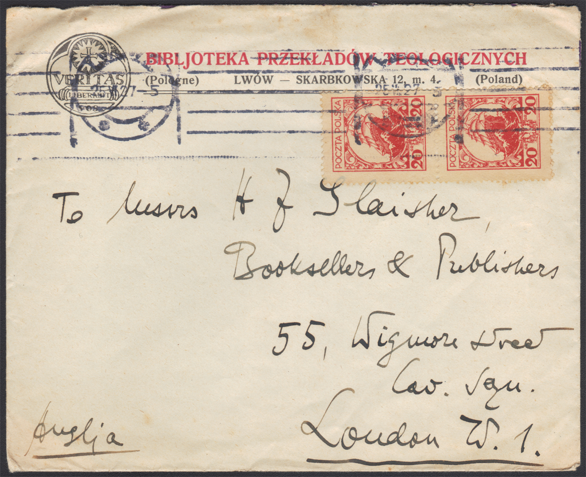 1925 wydanie obiegowe (różne rysunki), 20 gr - frankatura wielokrotna, list ofrankowany parką pionową wysłany 25.VII.27 z urzędu Lwów 2 do Londynu, znaczki skasowane wirnikowym stemplem mechanicznym; koperta firmowa "BIBLJOTEKA PRZEKŁADÓW TEOLOGICZNYCH LWÓW SKARBKOWSKA 12. m. 4."; walor w dobrym stanie zachowania. | Fi.211I Mi.239I |