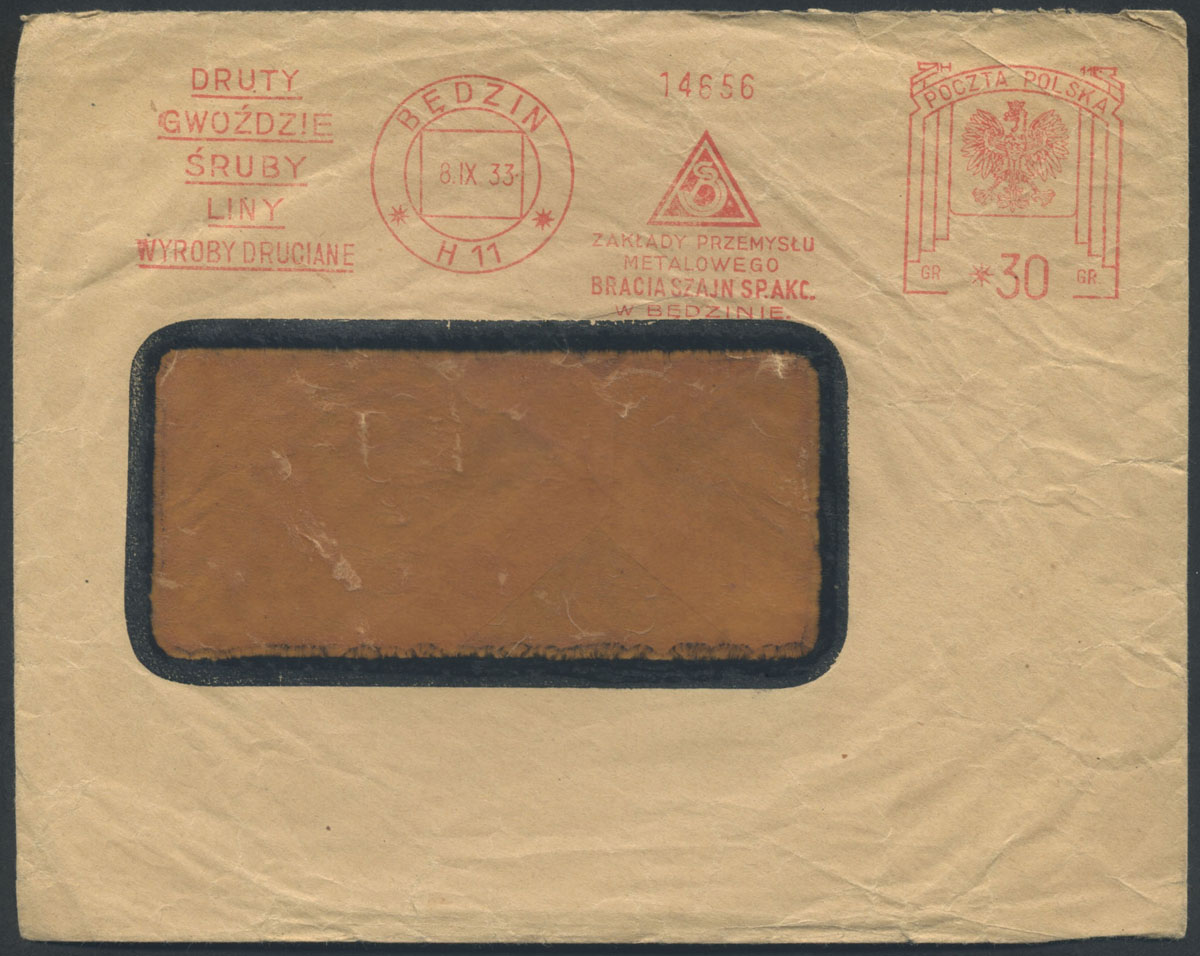 1933 list firmowy z Będzina opłacony frankaturą mechaniczną Zakładów Przemysłu Metalowego Bracia Szajn nr "H 11". | |