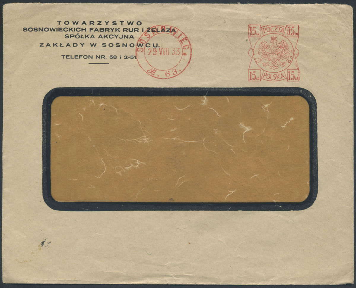 1933 list firmowy z Sosnowca opłacony frankaturą mechaniczną Towarzystwa Sosnowieckich Fabryk Rur i Żelaza nr "B. 63.". | |