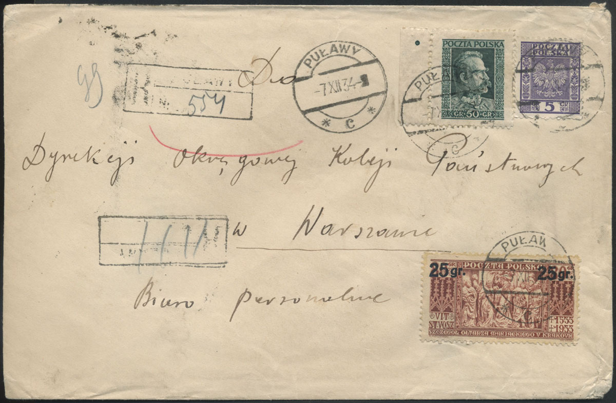 1934 list polecony z Puław do Warszawy, na odwrocie stemple odbiorcze. | Fi.238, 251, 270II |
